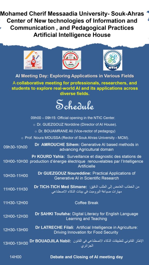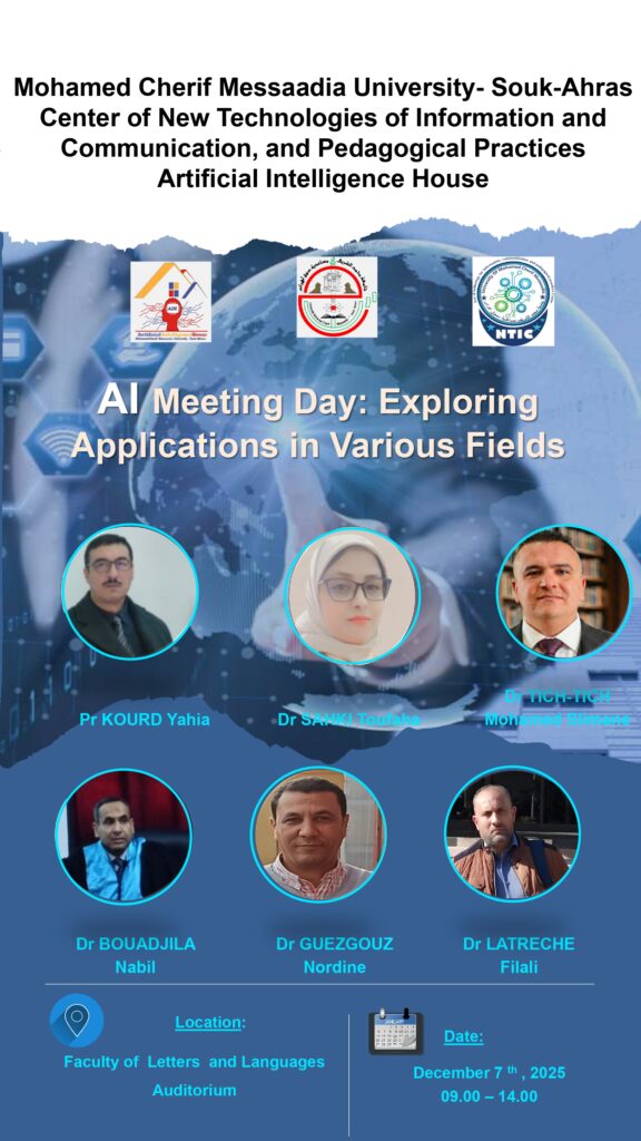 يسرّ مركز تكنولوجيا الحديثة للإعلام و الإتصال و الممارسات البيداغوجية و دار الذكاء الاصطناعي تحت إشراف السيدة مديرة الجامعة البروفيسور نورة موسى أن يعلن عن تنظيم يوم بعنوان: