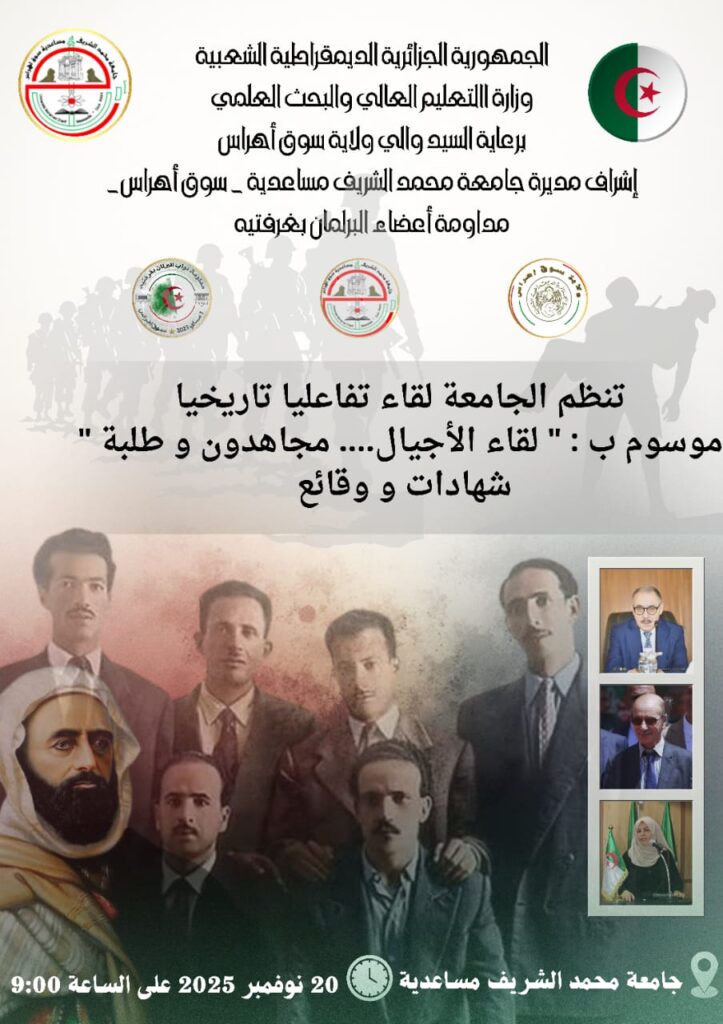تتشرف السيدة مديرة جامعة محمد الشريف مساعدية – سوق أهراس، البروفيسور نورة موسى، بدعوة كافة أفراد الأسرة الجامعية، وخاصة الطلبة، لحضور اللقاء التفاعلي التاريخي الموسوم بـ “لقاء للأجيال… مجاهدون وطلبة”، من تنشيط عضو مجلس الأمة، المجاهد حمة شوشان، الذي سيقدّم شهادات ووقائع حيّة من تاريخنا الوطني، وذلك يوم الخميس 20 نوفمبر 2025 بالمسمع الجامعي ابتداءً من الساعة التاسعة صباحاً. حضوركم دعم للذاكرة الوطنية وترسيخ لقيم الثورة في وجدان الطلبة.