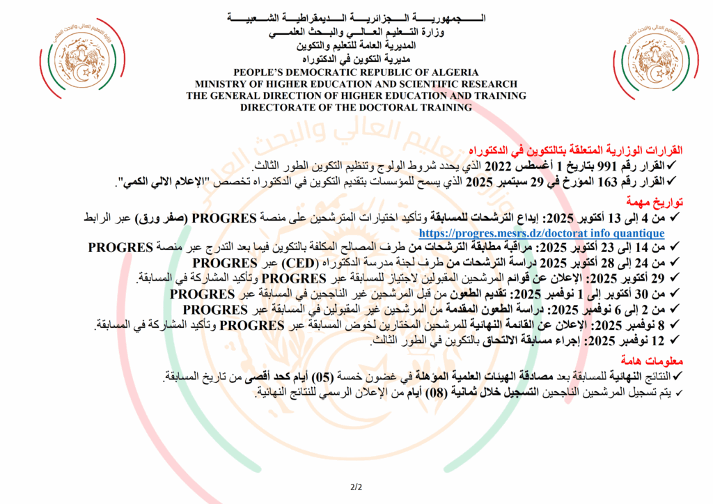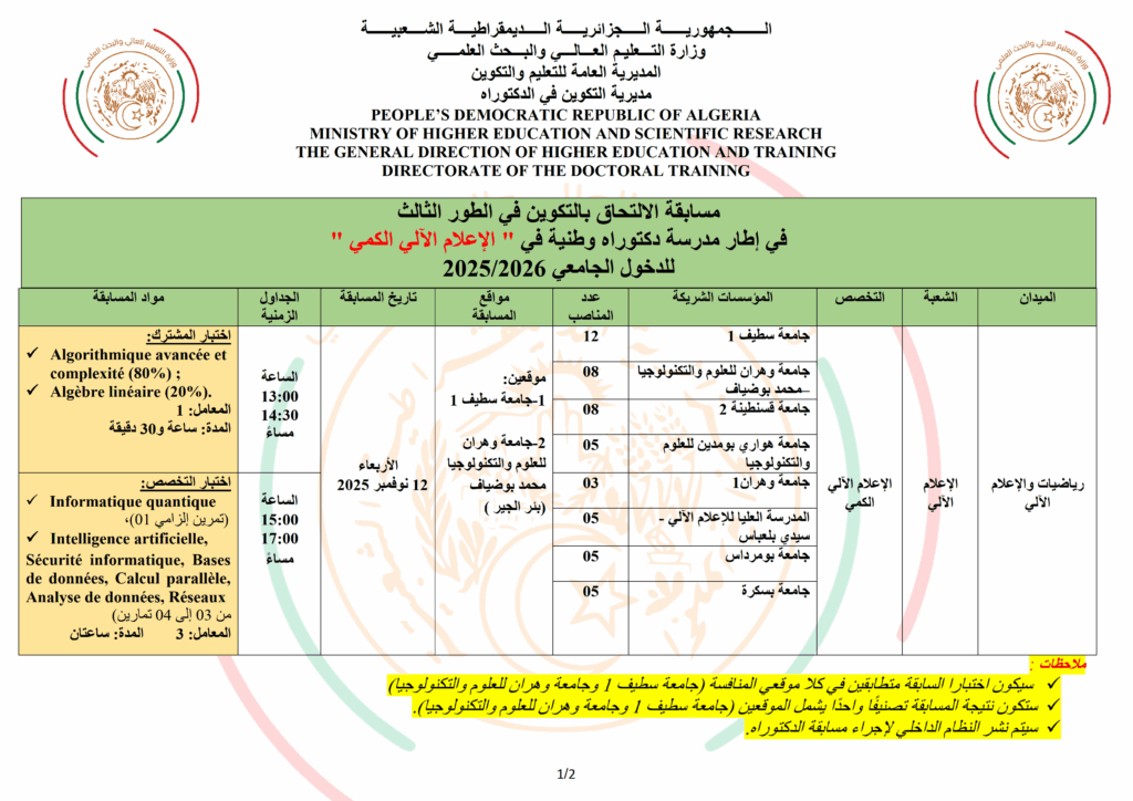 مسابقة الالتحاق بالتكوين في الطور الثالث في إطار مدرسة دكتوراه وطنية في ” الإعلام الآلي الكمي “للدخول الجامعي 2025/2026 الخميس 23 أكتوبر 2025 10:32 الخميس 23 أكتوبر 2025 11:32