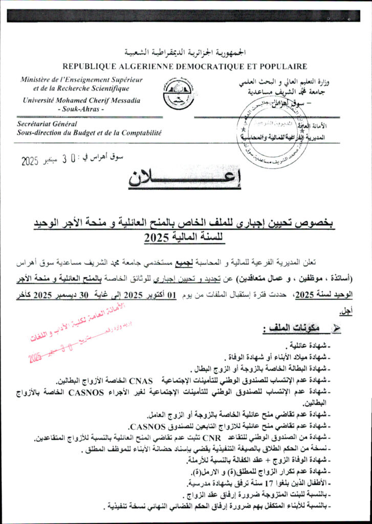 الإعلان الخاص بالتحيين الإجباري لملف المنح العائلية ومنحة الأجر الوحيد 2025 الأربعاء 1 أكتوبر 2025 10:15 الأربعاء 1 أكتوبر 2025 10:15 اعلان تحيين اجباري لملف المنح العائلية 001Download