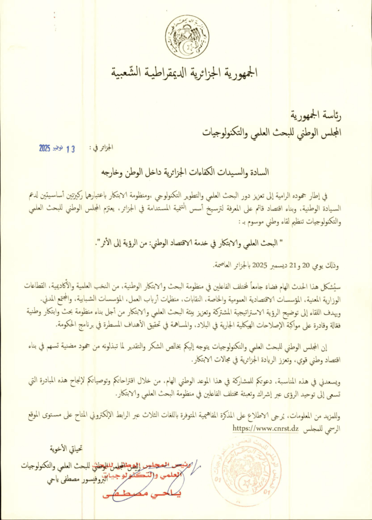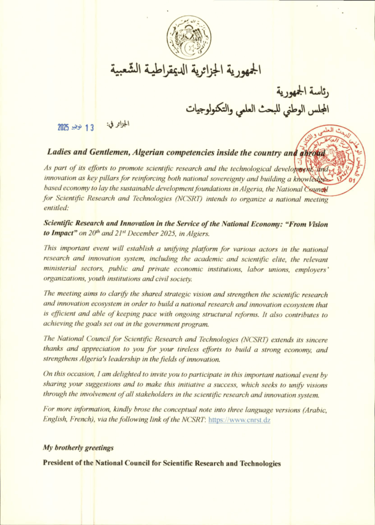 كلمة رئيس المجلس الوطني للبحث العلمي والتكنولوجيات موجهة للكفاءات الوطنية داخل وخارج الوطن بخصوص اللقاء الوطني الموسوم ب:” البحث العلمي والابتكار في خدمة الإقتصاد الوطني: من الرؤية إلى الأثر”