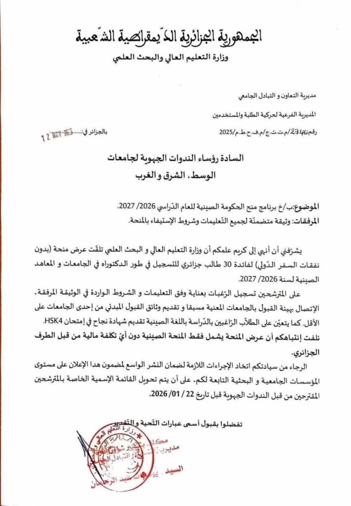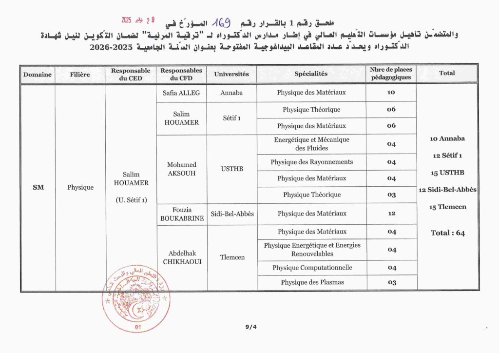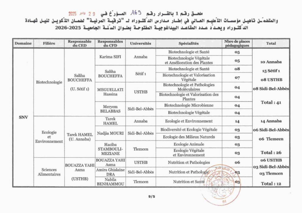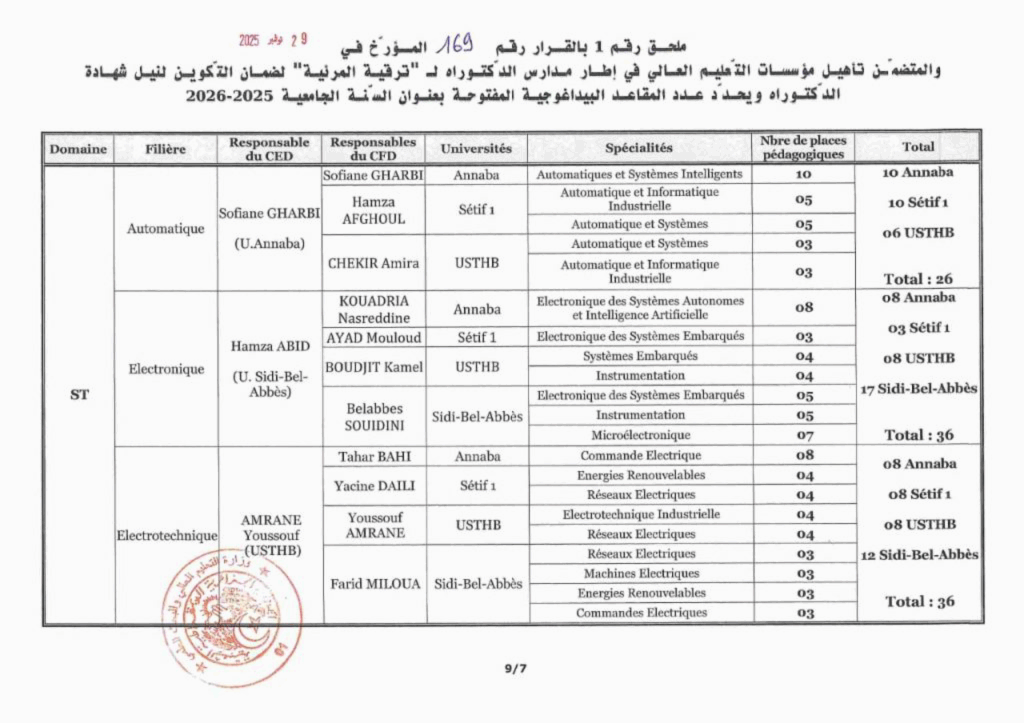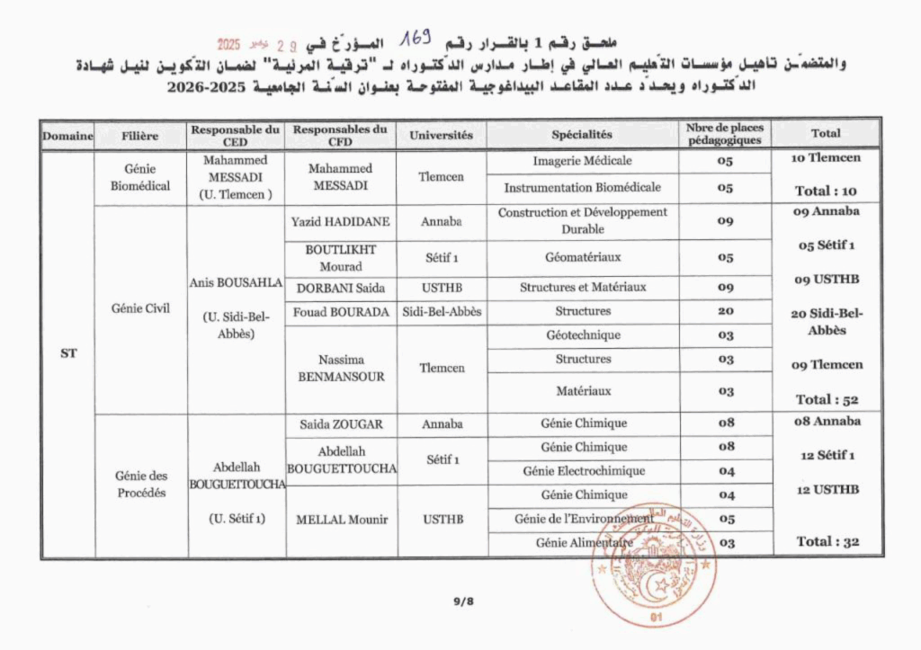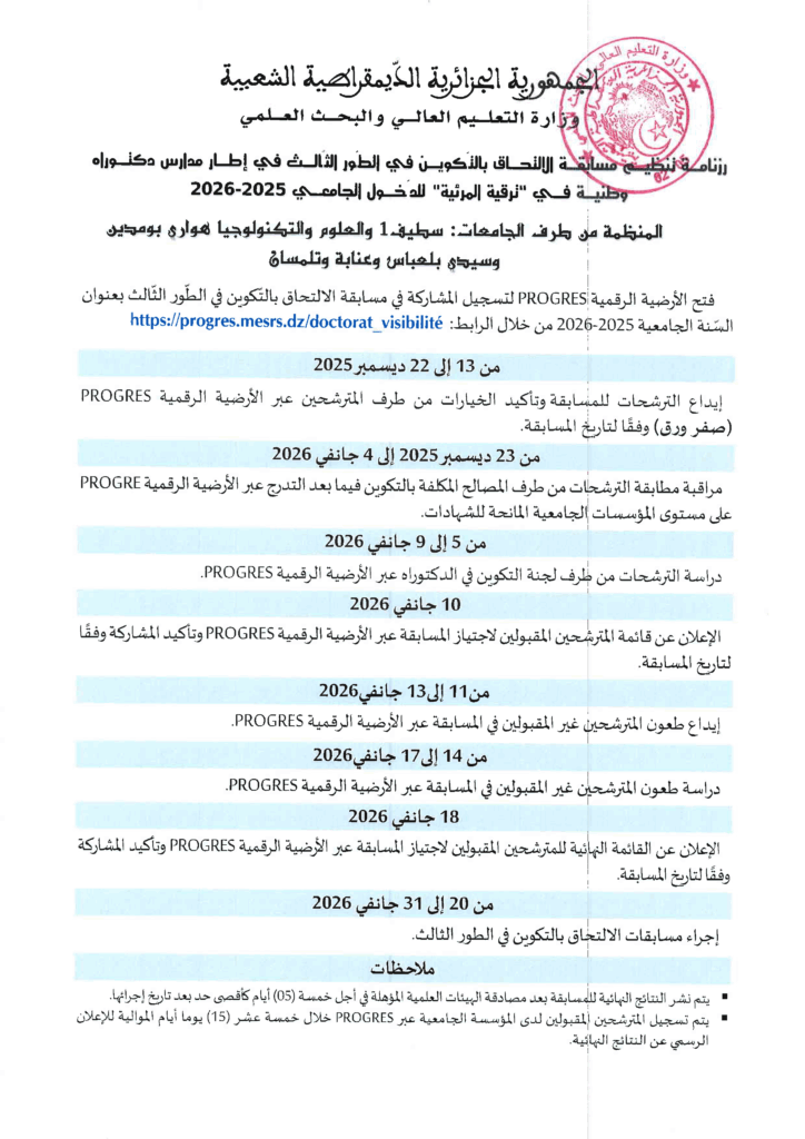 تعلن وزارة التعليم العالي والبحث العلمي، عن تنظيم مسابقة الالتحاق بالطور الثالث في إطار مدارس دكتوراه وطنية في “ترقية المرئية”، بعنوان السنة الجامعية(2025/2026)، على مستوى خمس جامعات ” جامعة سطيف1، جامعة العلوم والتكنولوجيا هواري بومدين، جامعة تلمسان، جامعة عنابة وجامعة سيدي بلعباس “