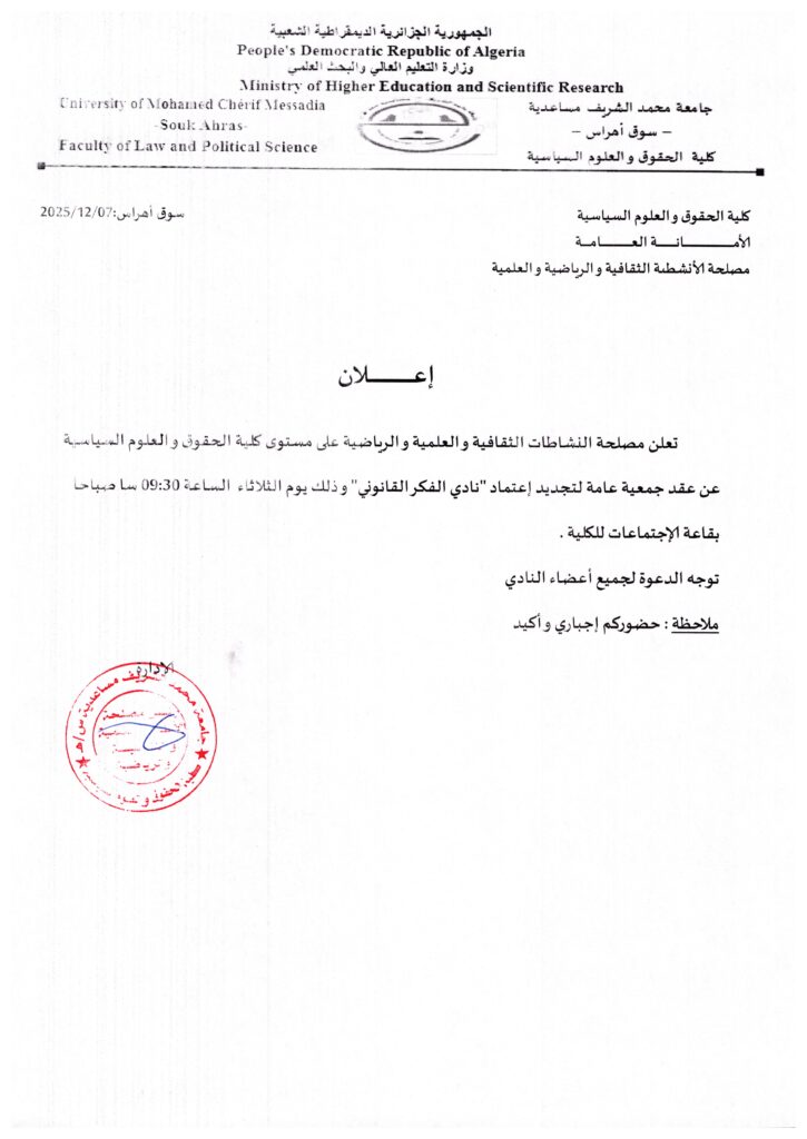 يعتزم مخبر الدراسات اللغوية والأدبية اقامة ندوة بمناسبة اليوم العالمي للغة العربية يوم الثلاثاء 09 ديسمبر 2025