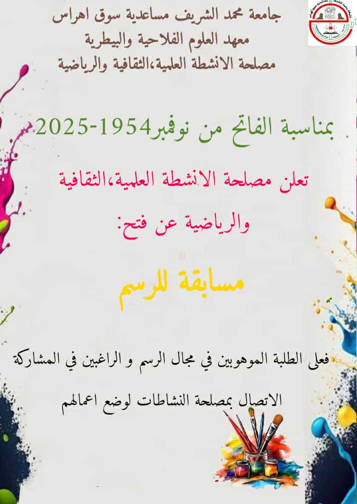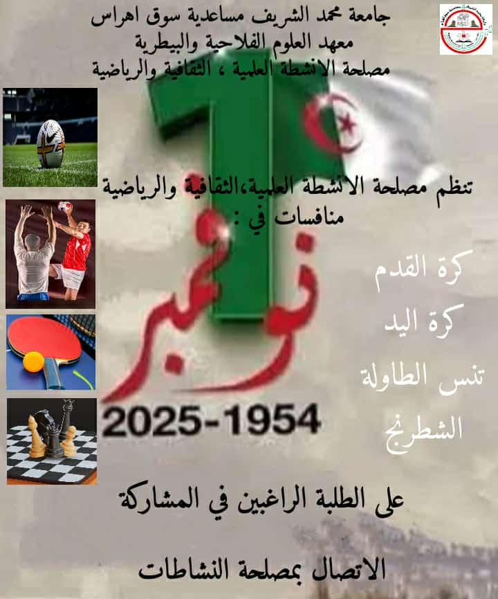 بمناسبة الإحتفال بعيد الثورة ، تعلن مصلحة الأنشطة العلمية و الثقافية و الرياضية بمعهد العلوم الفلاحية و البيطرية عن تنظيم مسابقات في مختلف الرياضات و كذا الرسم فعلى الطلبة الراغبين بالمشاركة التقدم إلى رئيس المصلحة من اجل تسجيل و تقديم رسوماتهم.
