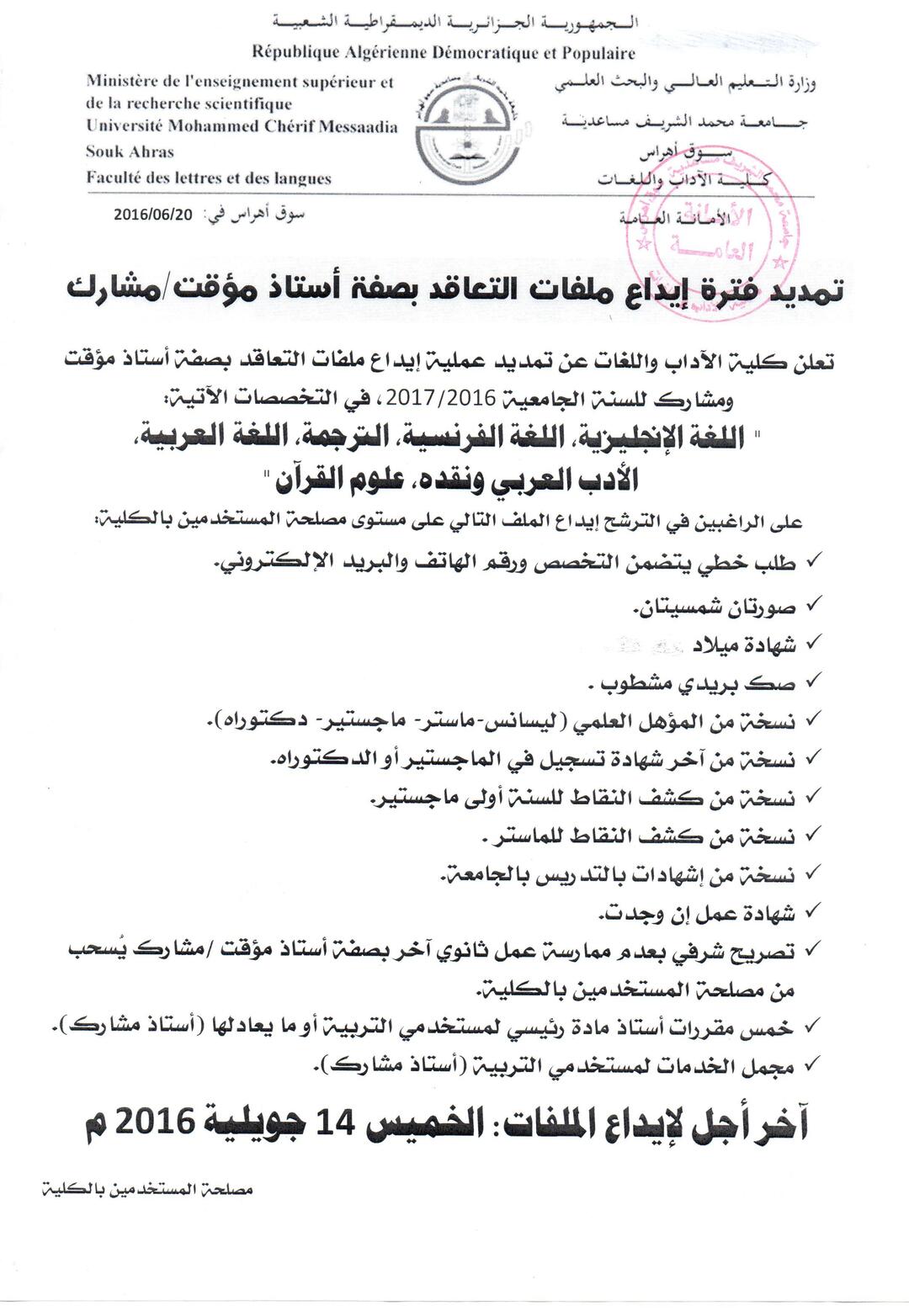 تمديد فترة إيداع فترة التعاقد بصفة أستاذ مؤقت / مشارك