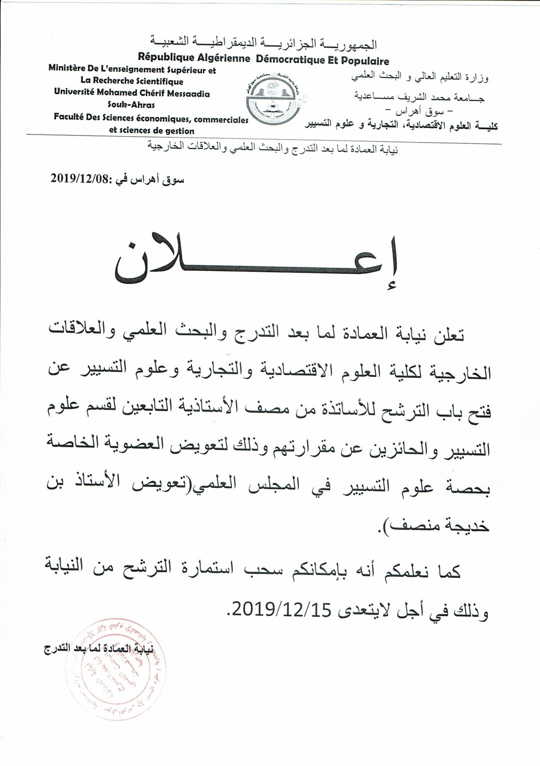 اعلان عن فتح باب الترشح لتعويض العضوية الخاصة بحصة علوم التسيير في المجلس العلمي