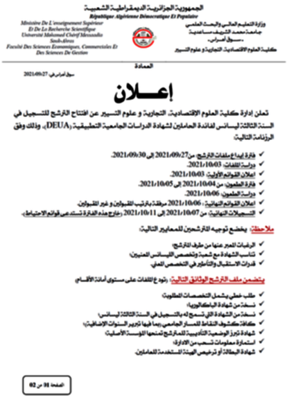 اعلان الترشح للتسجيل في السنة الثالثة ليسانس لحاملي شهادة DEUA