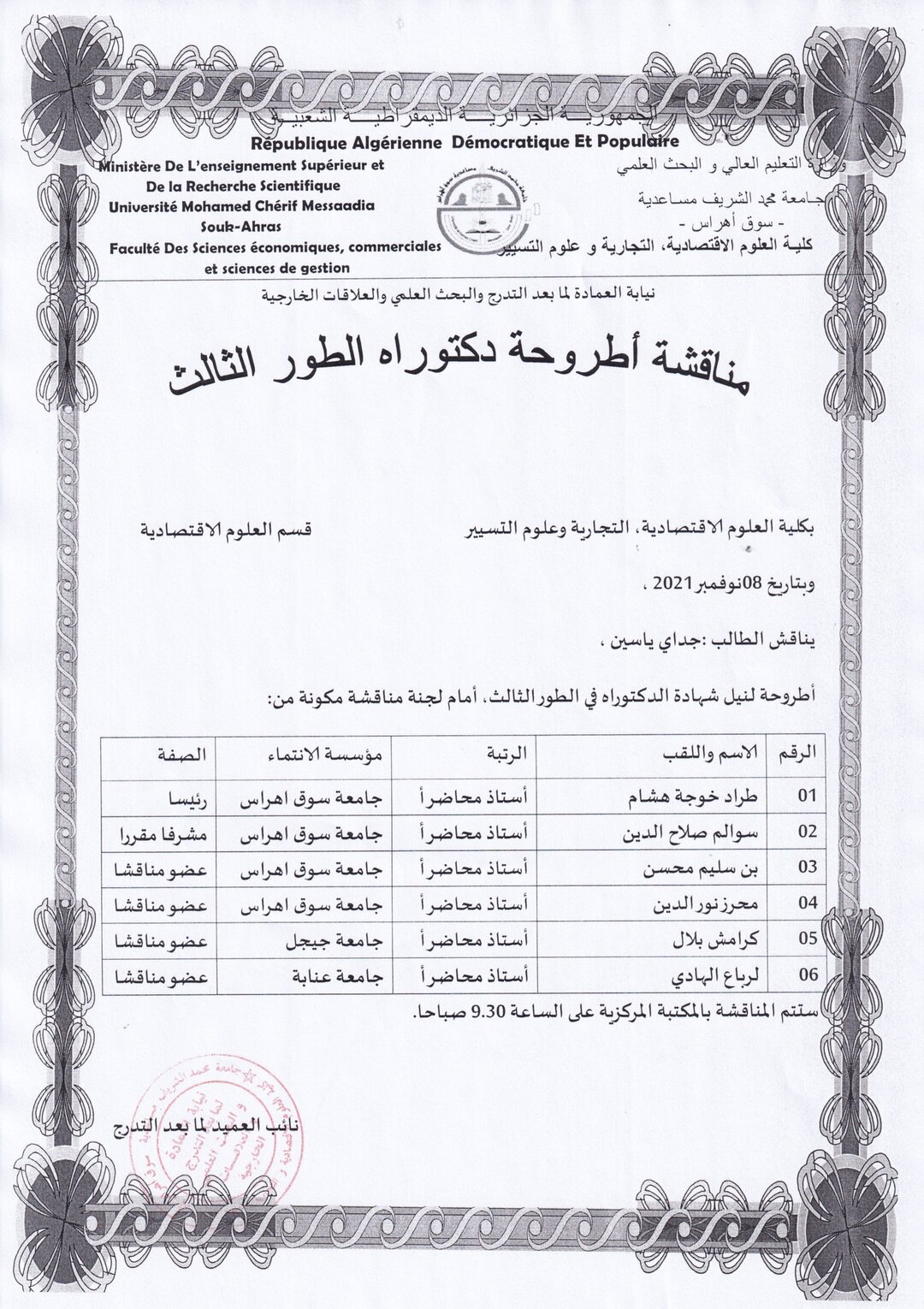مناقشة اطروحة دكتوراه الطور الثالث للطالب جداي ياسين