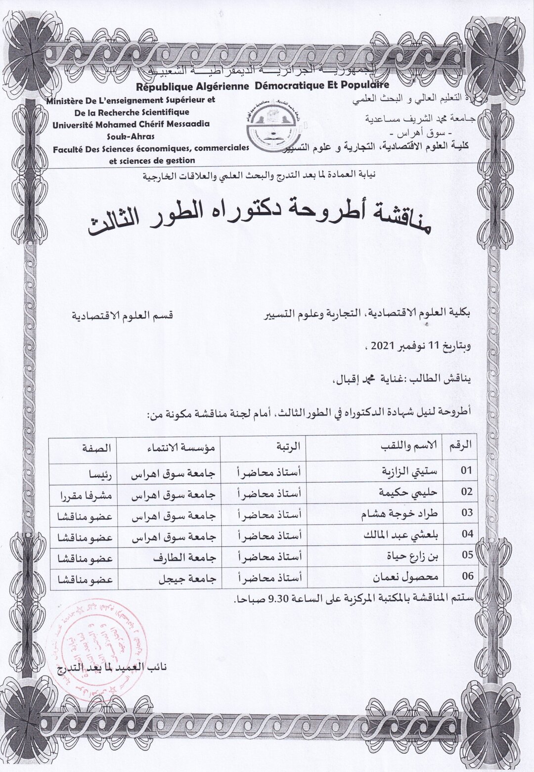 مناقشة اطروحة دكتوراه الطور الثالث للطالب غناية محمد اقبال