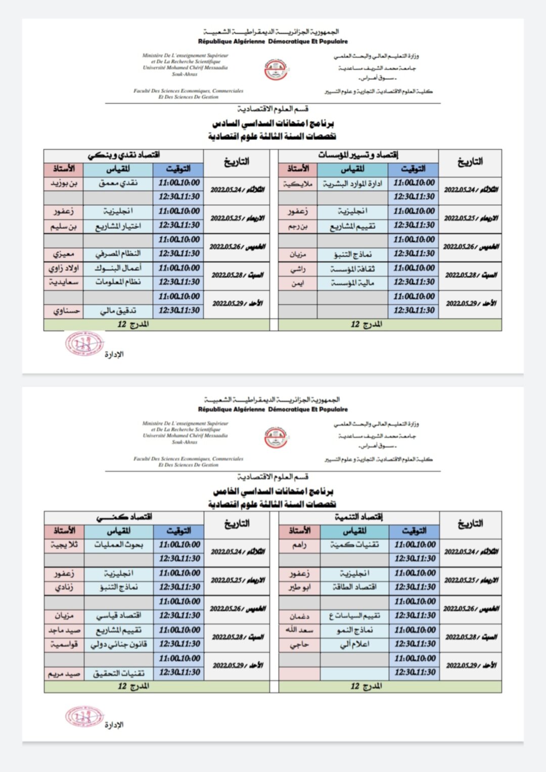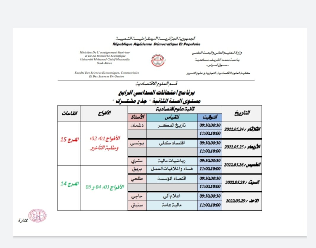 رزنامة امتحانات السداسيات الزوجية لدفعة الثانية