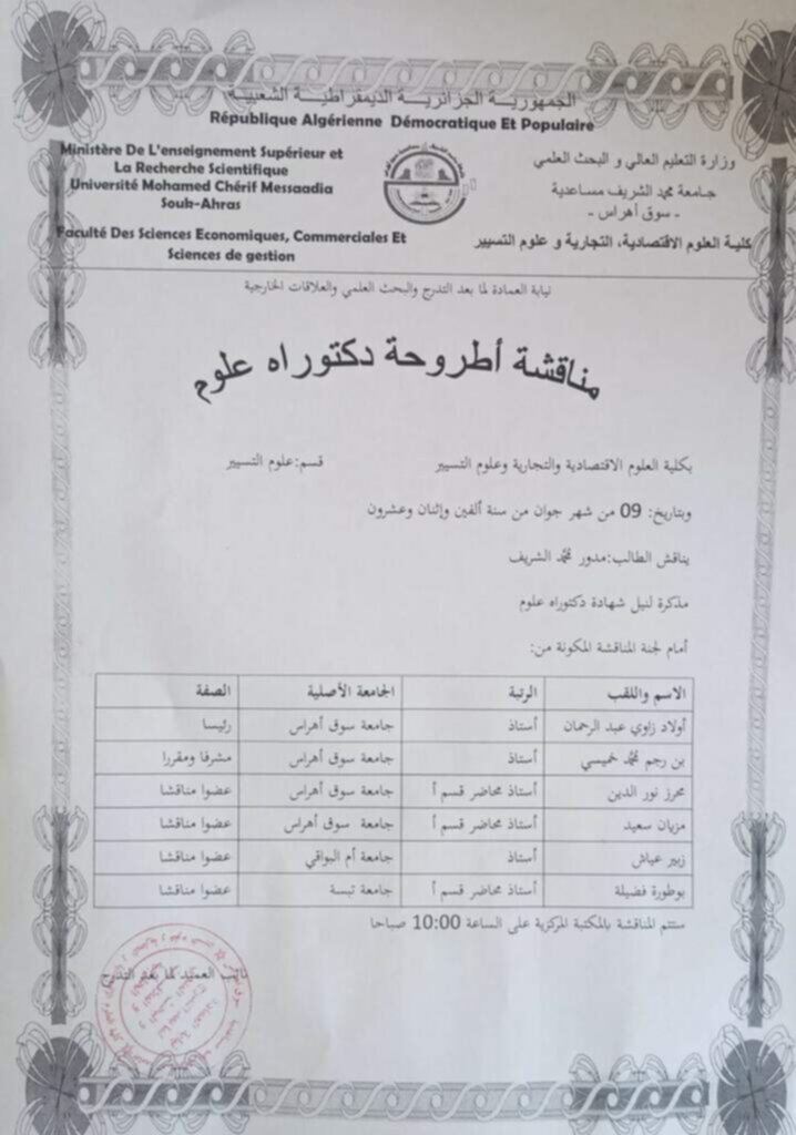 مناقشة اطروحة دكتوراه علوم الطالب مدور محمد الشريف
