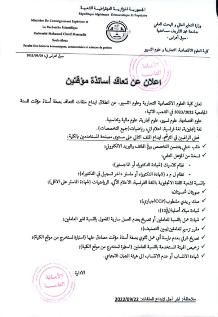 إعلان عن تعاقد أساتذة مؤقتين