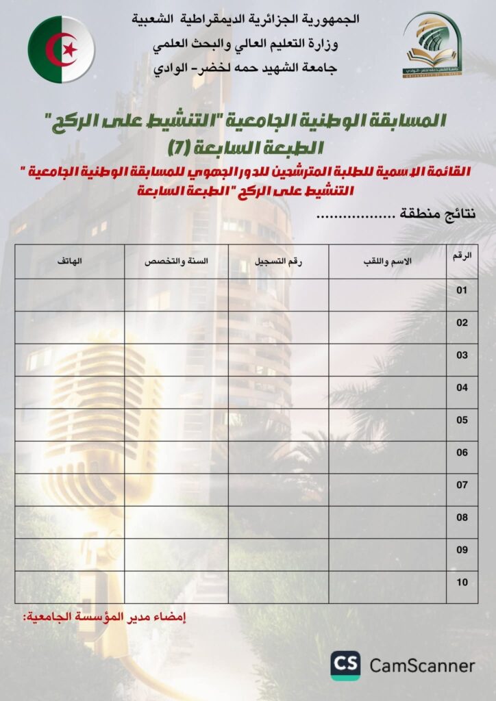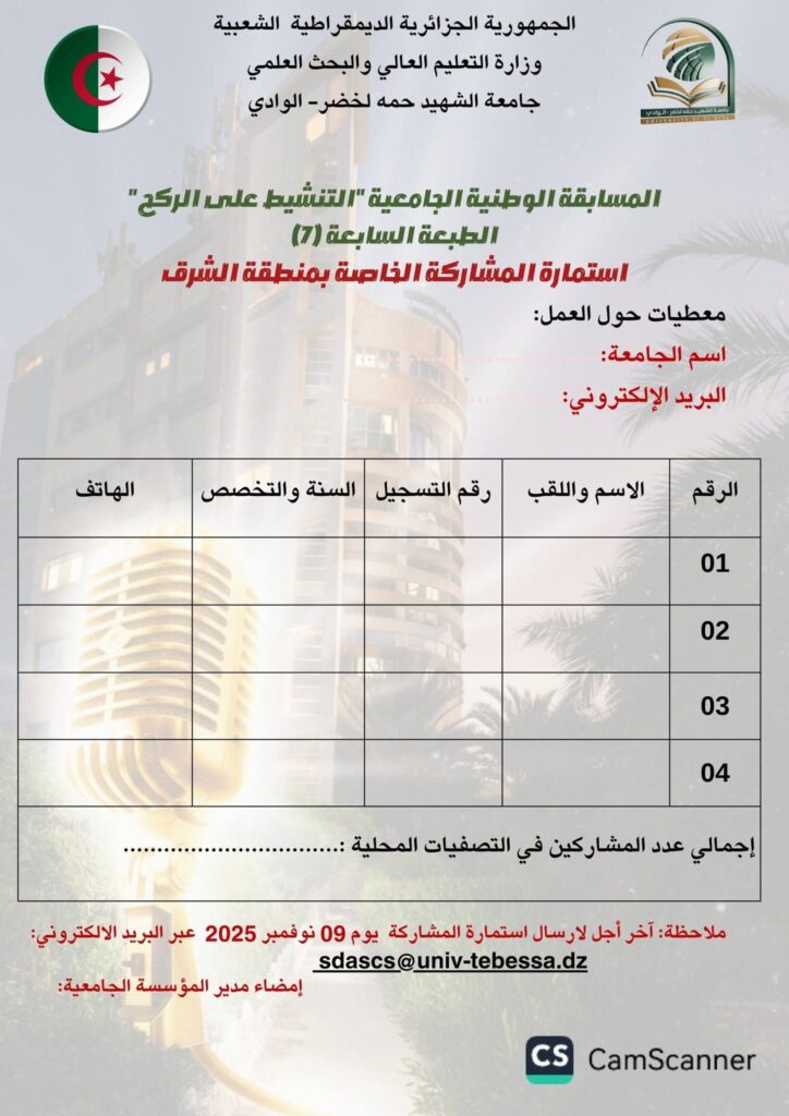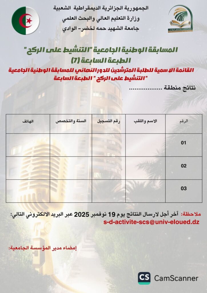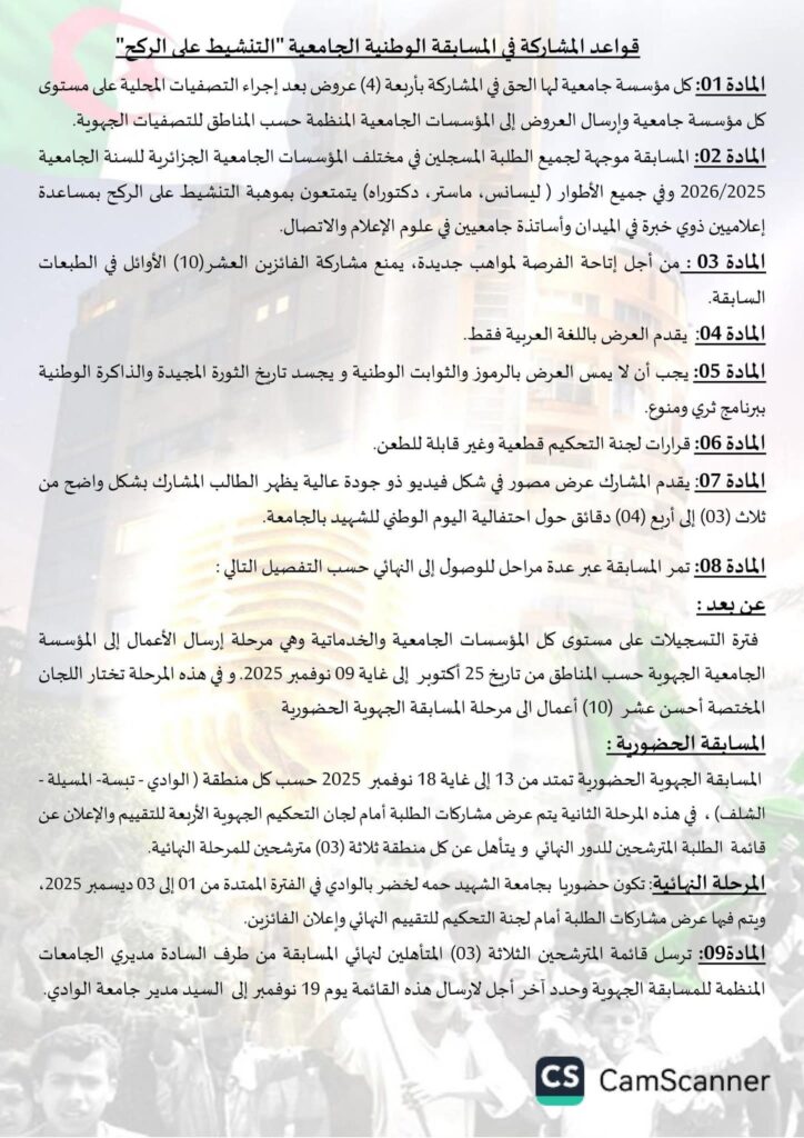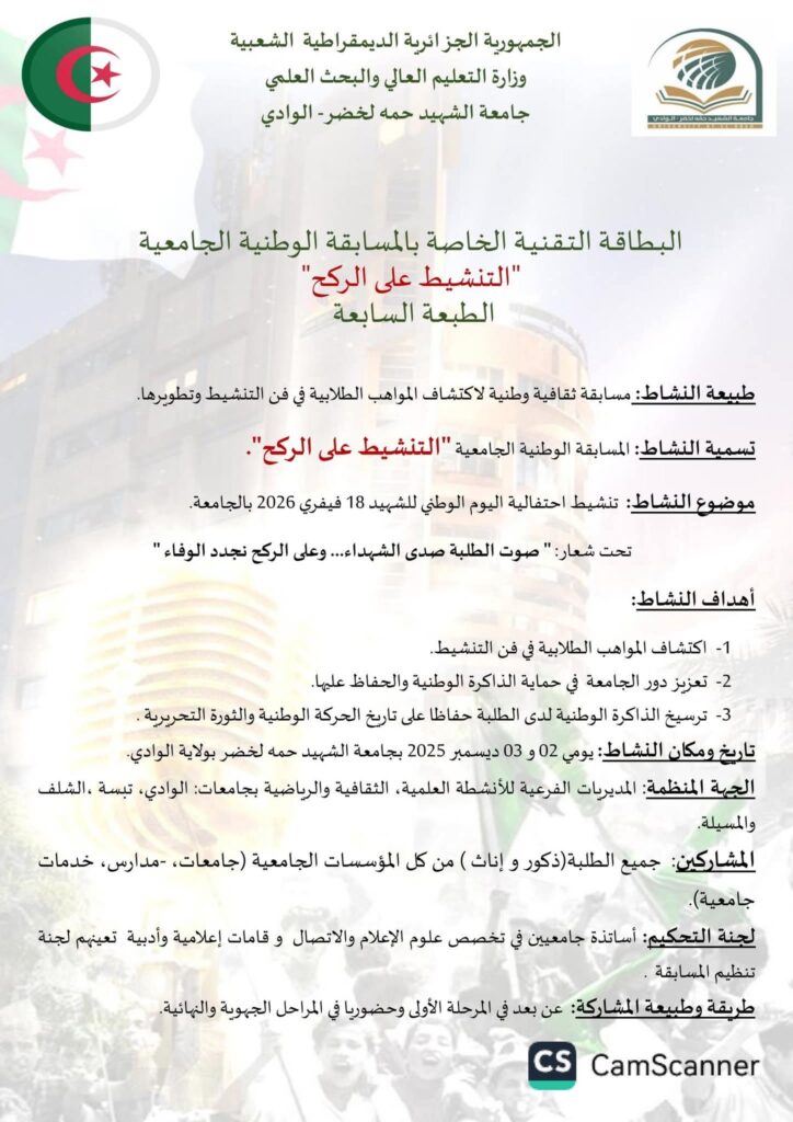 تنظم جامعة #الشهيد_حمة_لخضر_الوادي الطبعة السابعة للمسابقة الوطنية “التنشيط على الركح” عن بعد وحضوري تحت شعار #صوت_الطلبة_صدى_الشهداء_وعلى_الركح_نجدد_الوفاء.