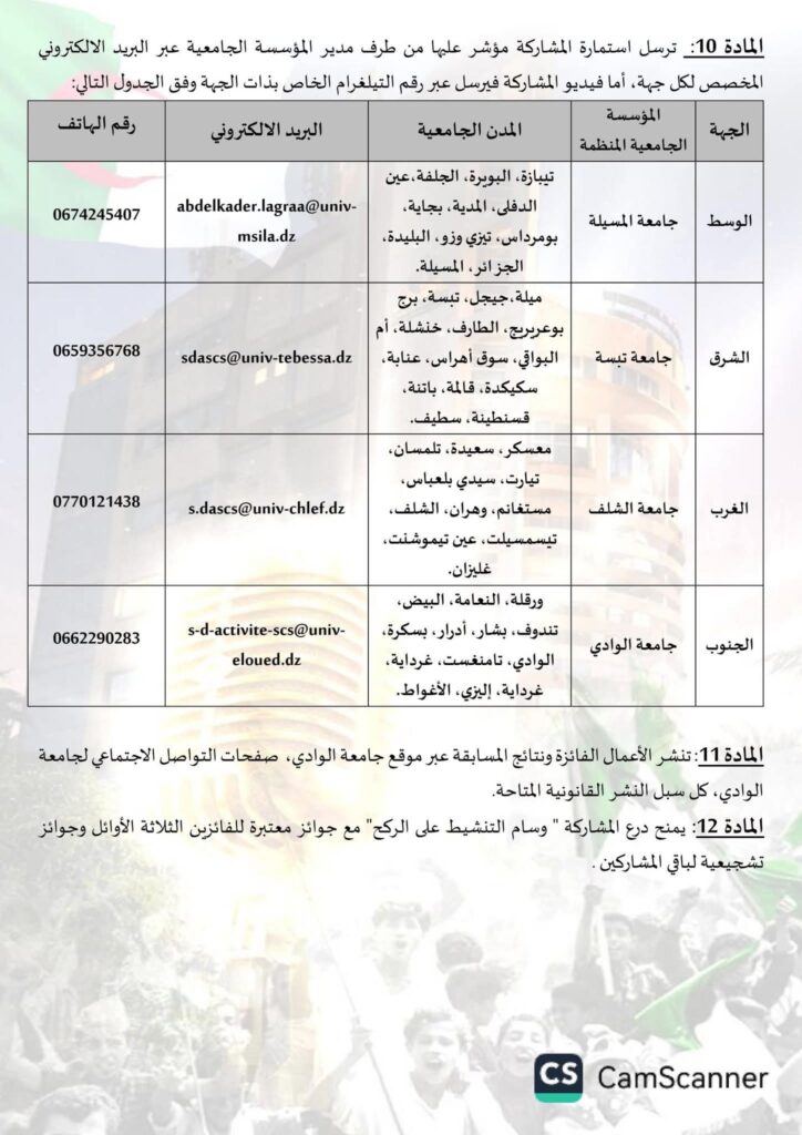 للمزيد من الاستفسارات الاتصال بالمديرية الفرعية للانشطة العلمية الثقافية والرياضية المتواجدة في فضاء المشترك بالقطب الجامعي الجديد وكذا المصالح للانشطة العلمية الثقافيةوالرياضية التابعة للكليات