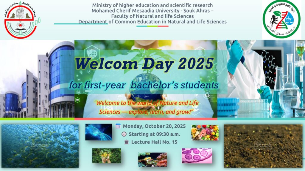 في أجواء مفعمة بالحيوية والترحيب، نظم قسم التعليم المشترك في علوم الطبيعة والحياة فعالية “Welcome Day” الخاصة بطلبة السنة الأولى ليسانس، وذلك بهدف تعريفهم بالمسار الجامعي، بنظام الدراسة، وبالفرص الأكاديمية التي توفرها كلية علوم الطبيعة والحياة – جامعة محمد الشريف مساعدية سوق أهراس.