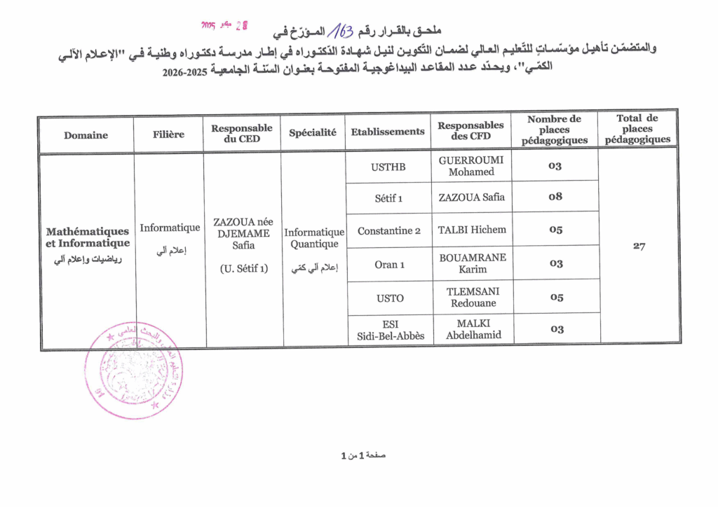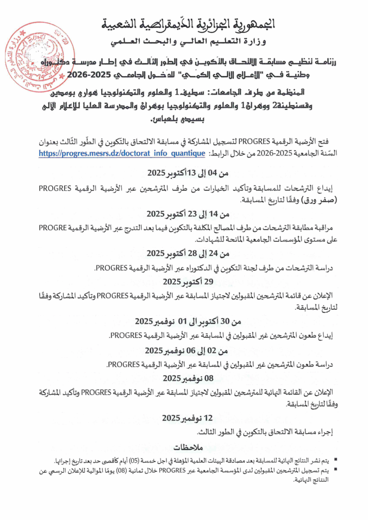 رزنامة تنظيم مسابقة الإلتحاق بالتكوين في الطور الثالث في إطار مدرسة دكتوراه وطنية في “الإعلام الالي الكمي” للدخول الجامعي 2025-2026 الخميس 2 أكتوبر 2025 10:24 الخميس 2 أكتوبر 2025 11:06 الرزنامة +عدد المقاعد البيداغوجية المفتوحة