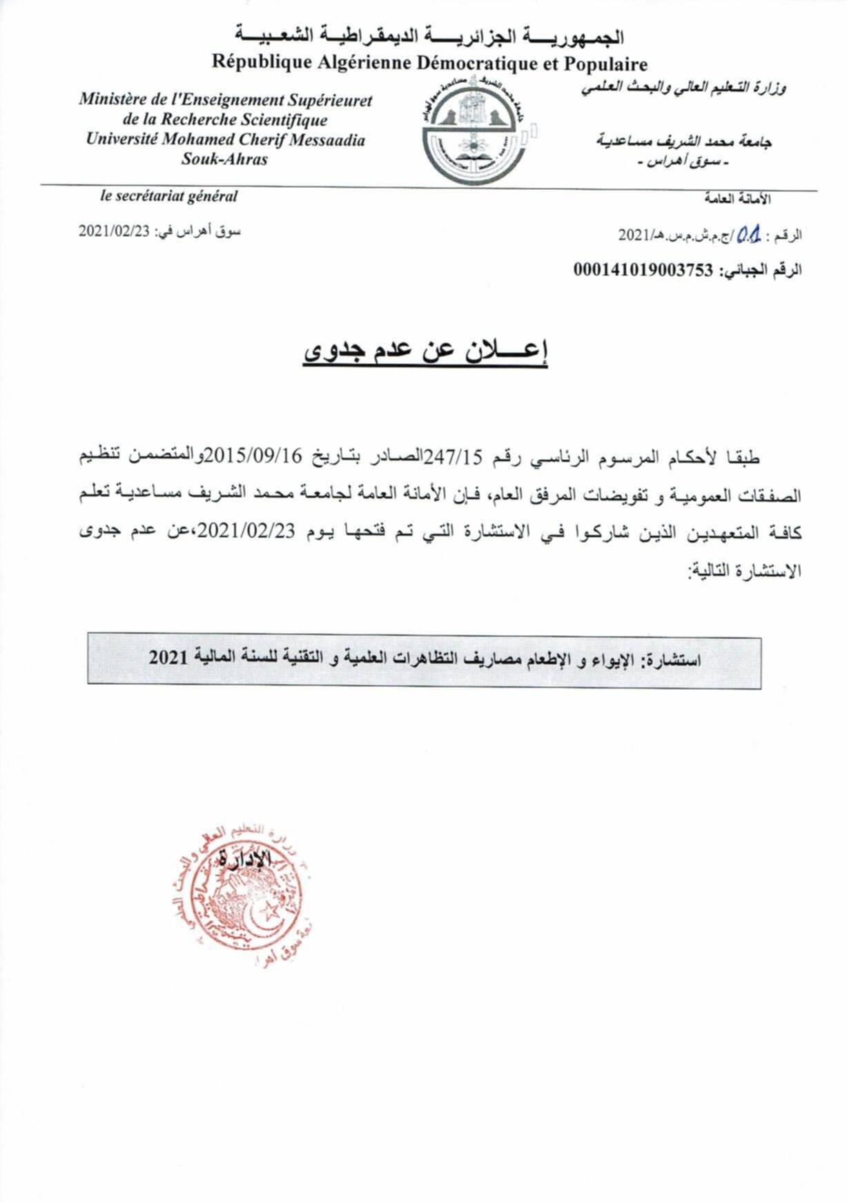 اعلان عن عدم جدوى