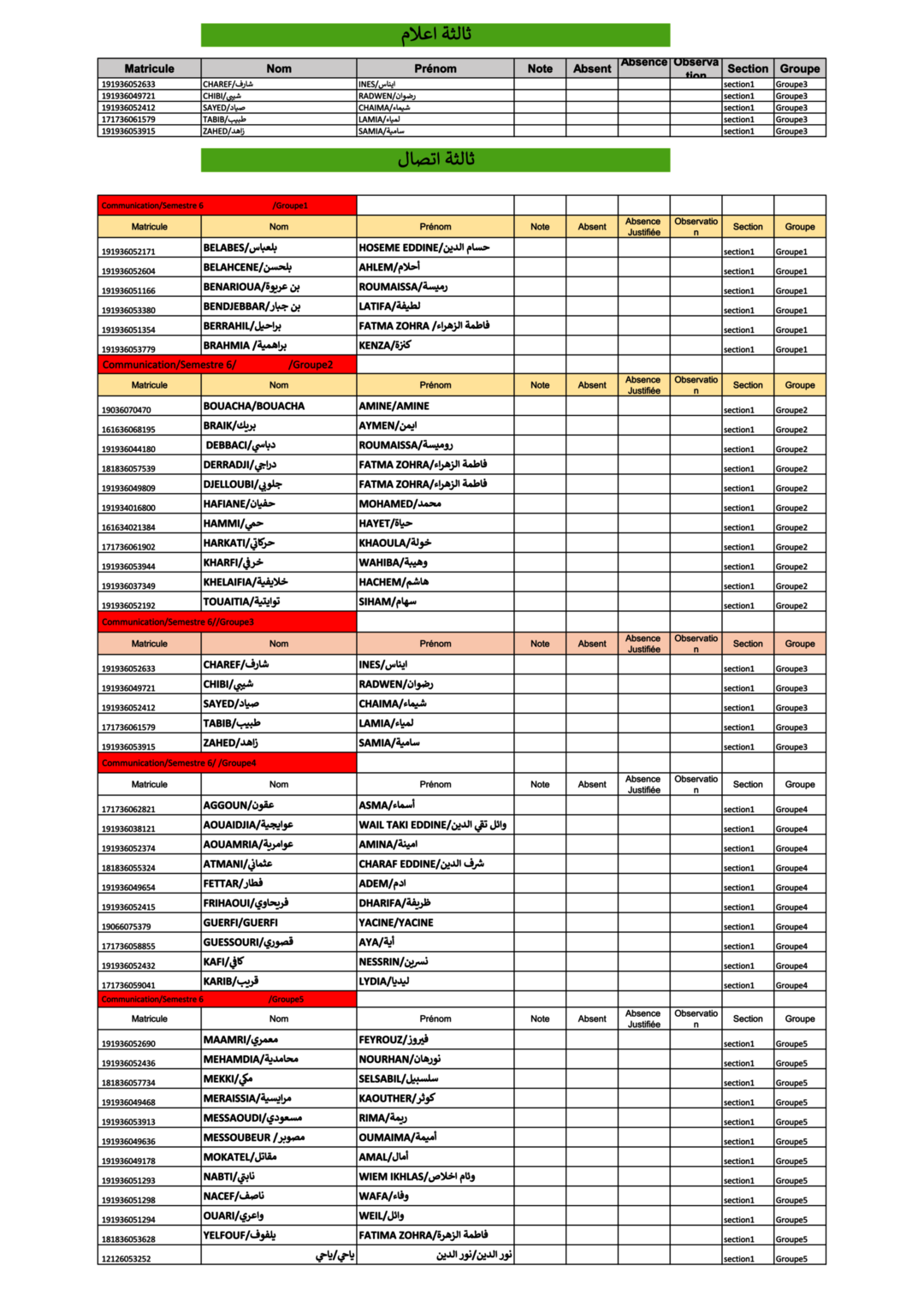 اسماء الطلبة الذين لم يقدم اساتذة الاشراف محضر علاماتهم على مستوى الإدارة Mon 30 May 2022 13:22 Mon 30 May 2022 13:22