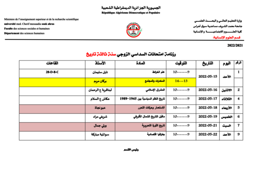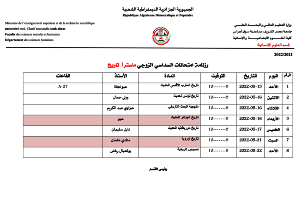 ليكن في علم طلبة السنة الثالثة تاريخ وماستر1 تاريخ أنه قد طرأ تغيير طارئ لرزنامة الامتحانات الخاصة بيوم الأربعاء 18 ماس 2022 ويوم السبت 21 ماي 2022.