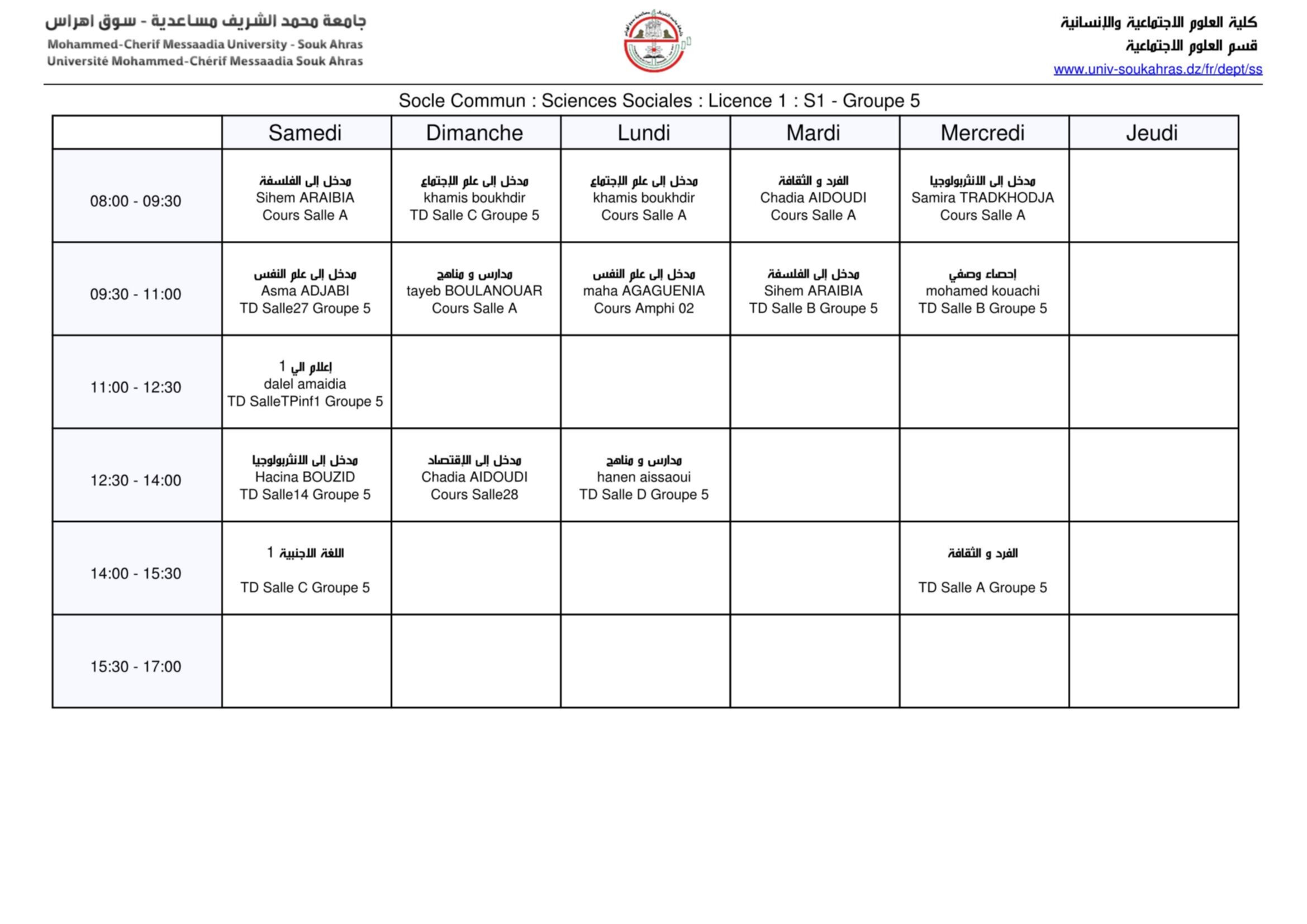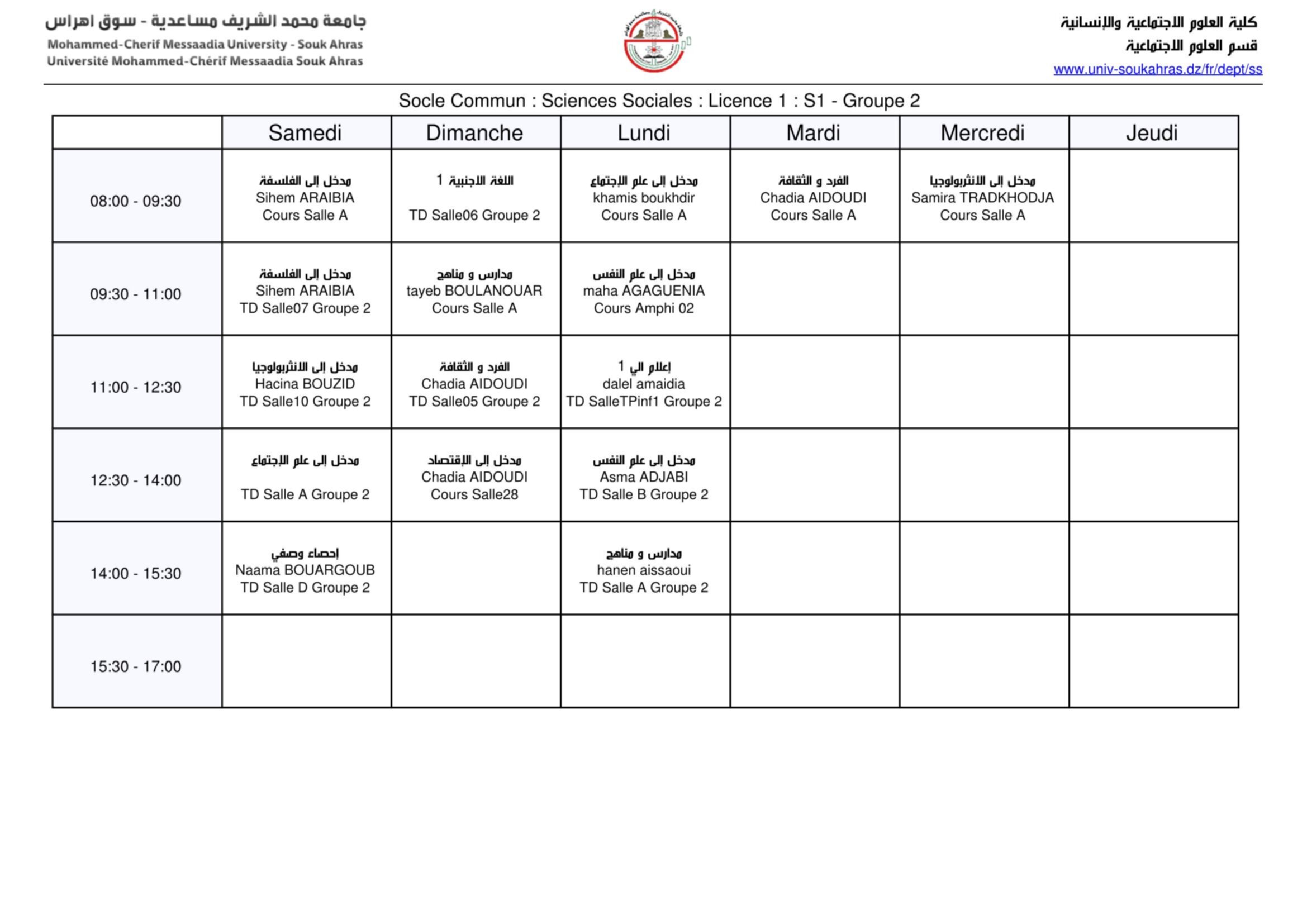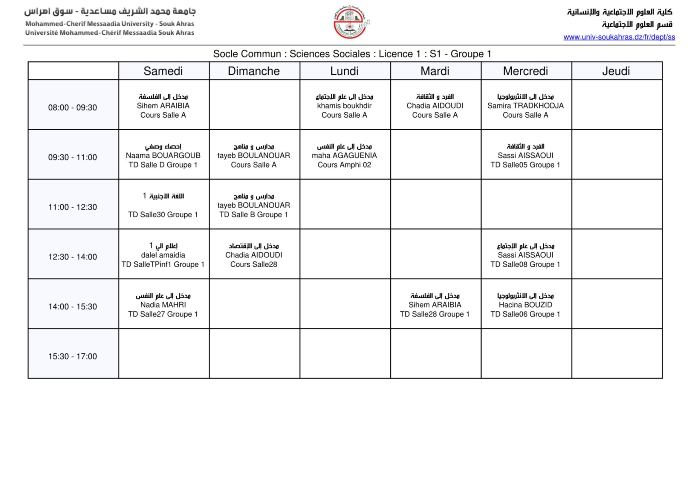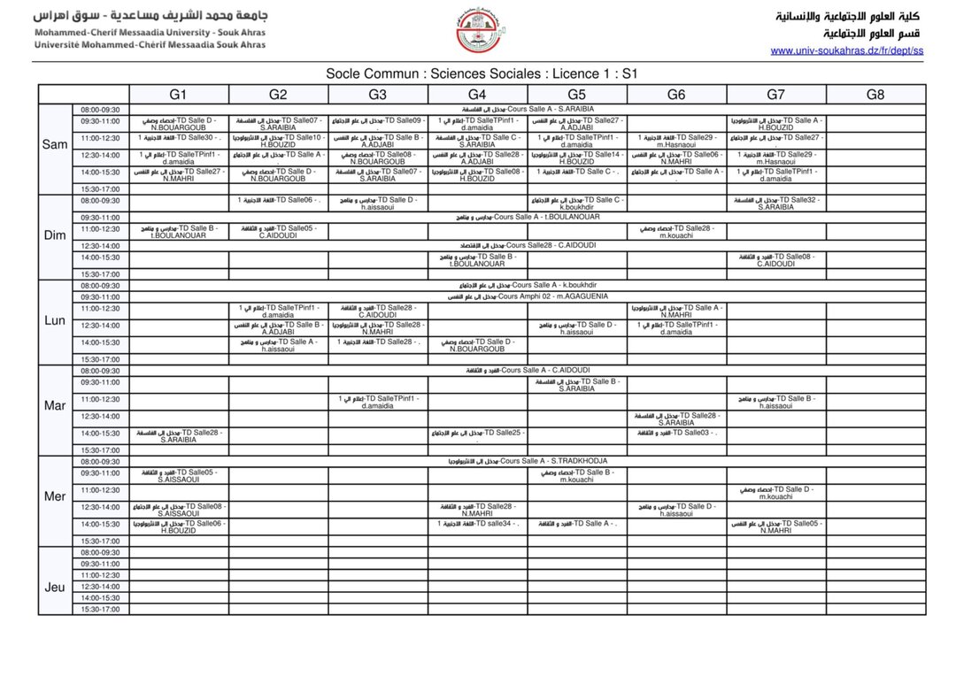 جدول إستعمال الزمن نهائي سنة أولى جذع مشترك علوم إجتماعية Fri 14 Oct 2022 09:58 Fri 14 Oct 2022 10:43 Sciences-Sociales-Licence-1-S1-Groupe-1Download Sciences-Sociales-Licence-1-S1-Groupe-2Download Sciences-Sociales-Licence-1-S1-Groupe-3Download Sciences-Sociales-Licence-1-S1-Groupe-4Download Sciences-Sociales-Licence-1-S1-Groupe-5Download Sciences-Sociales-Licence-1-S1-Groupe-6Download Sciences-Sociales-Licence-1-S1-Groupe-7Download Sciences-Sociales-Licence-1-S1Download