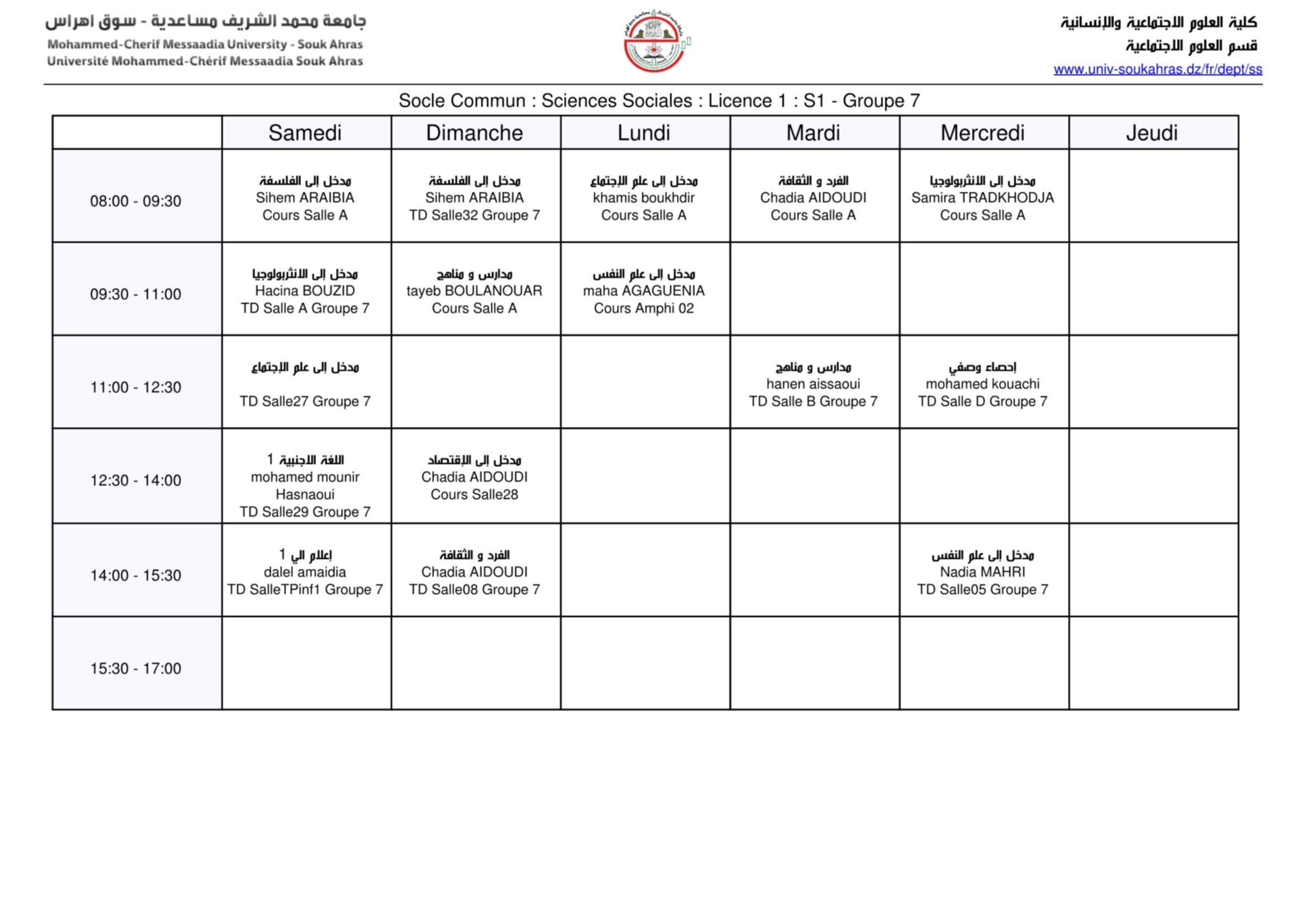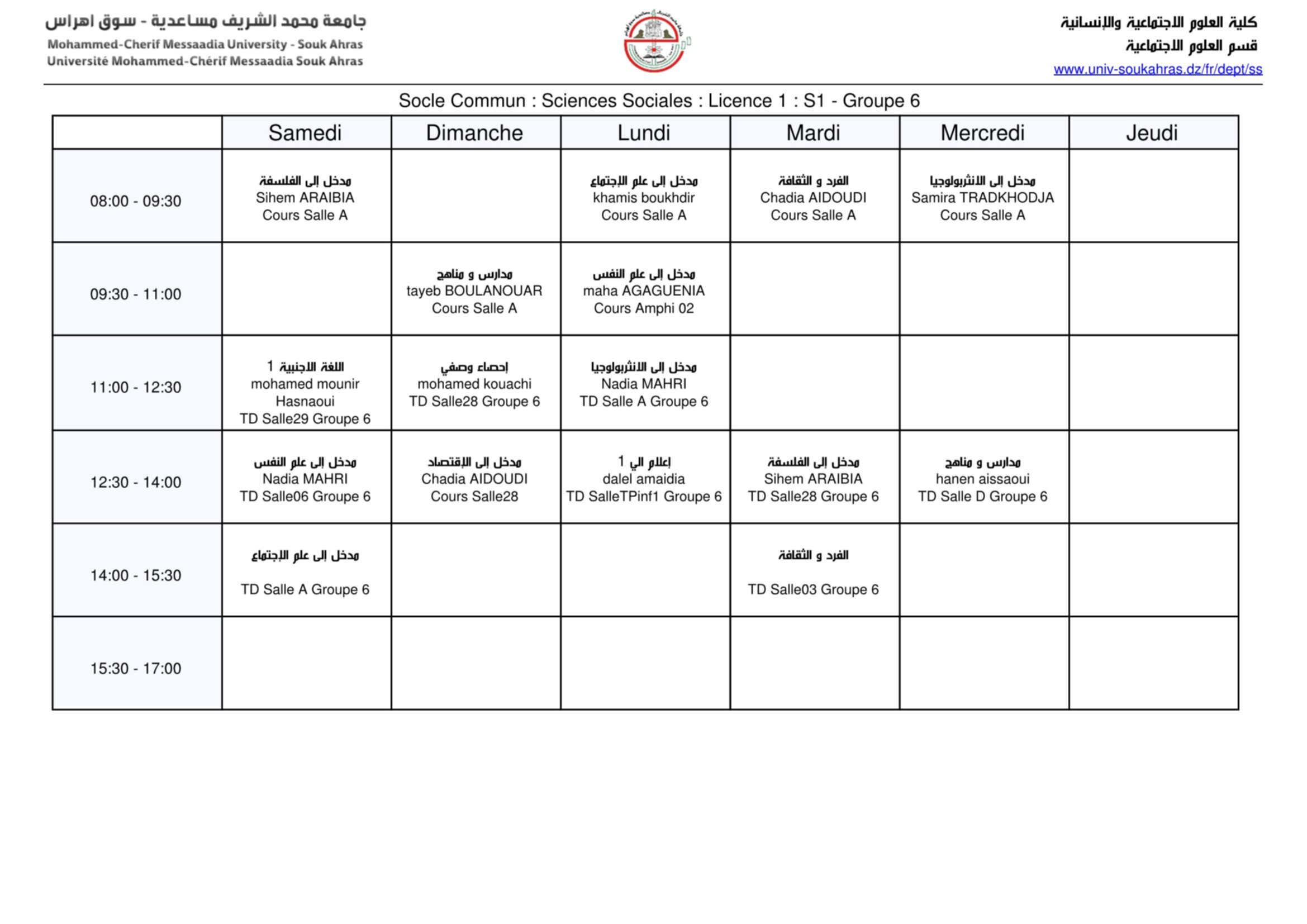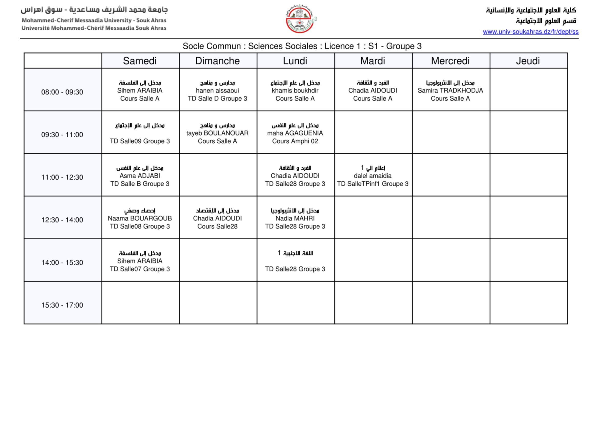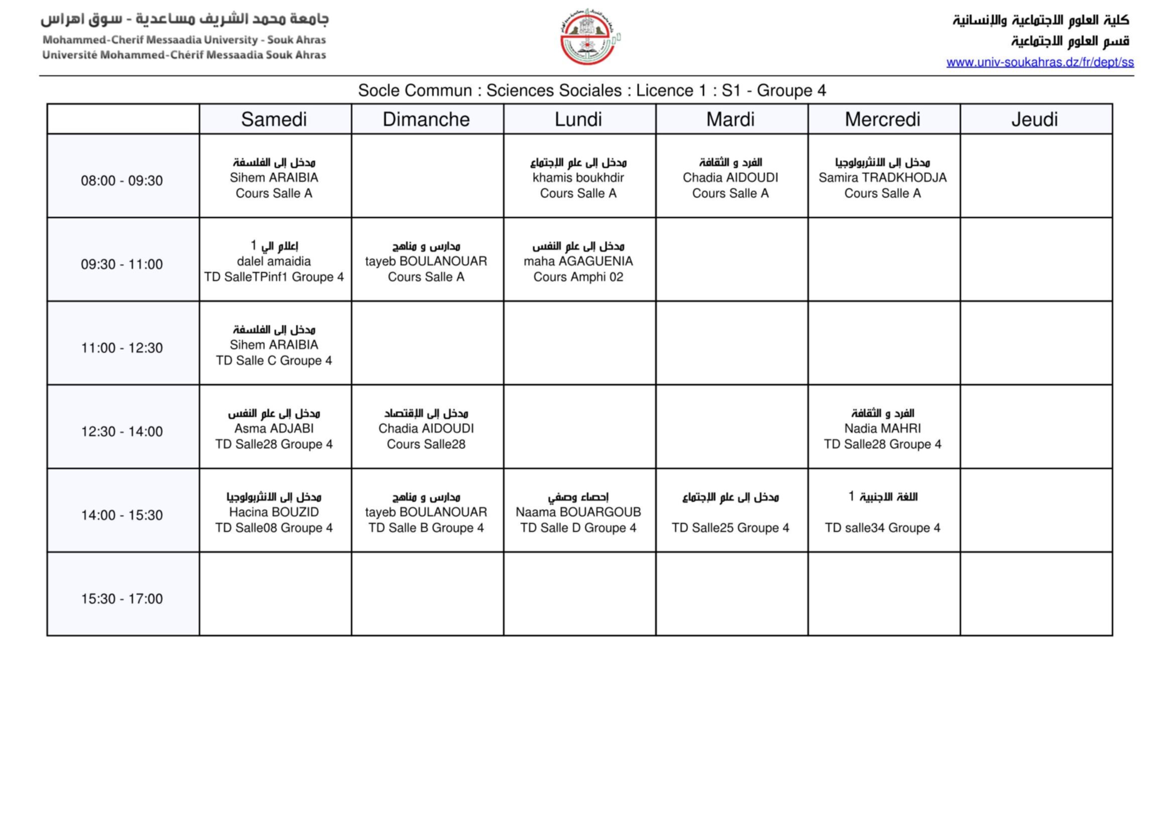 جدول إستعمال الزمن نهائي سنة أولى جذع مشترك علوم إجتماعية Fri 14 Oct 2022 09:58 Fri 14 Oct 2022 10:43 Sciences-Sociales-Licence-1-S1-Groupe-1Download Sciences-Sociales-Licence-1-S1-Groupe-2Download Sciences-Sociales-Licence-1-S1-Groupe-3Download Sciences-Sociales-Licence-1-S1-Groupe-4Download Sciences-Sociales-Licence-1-S1-Groupe-5Download Sciences-Sociales-Licence-1-S1-Groupe-6Download Sciences-Sociales-Licence-1-S1-Groupe-7Download Sciences-Sociales-Licence-1-S1Download