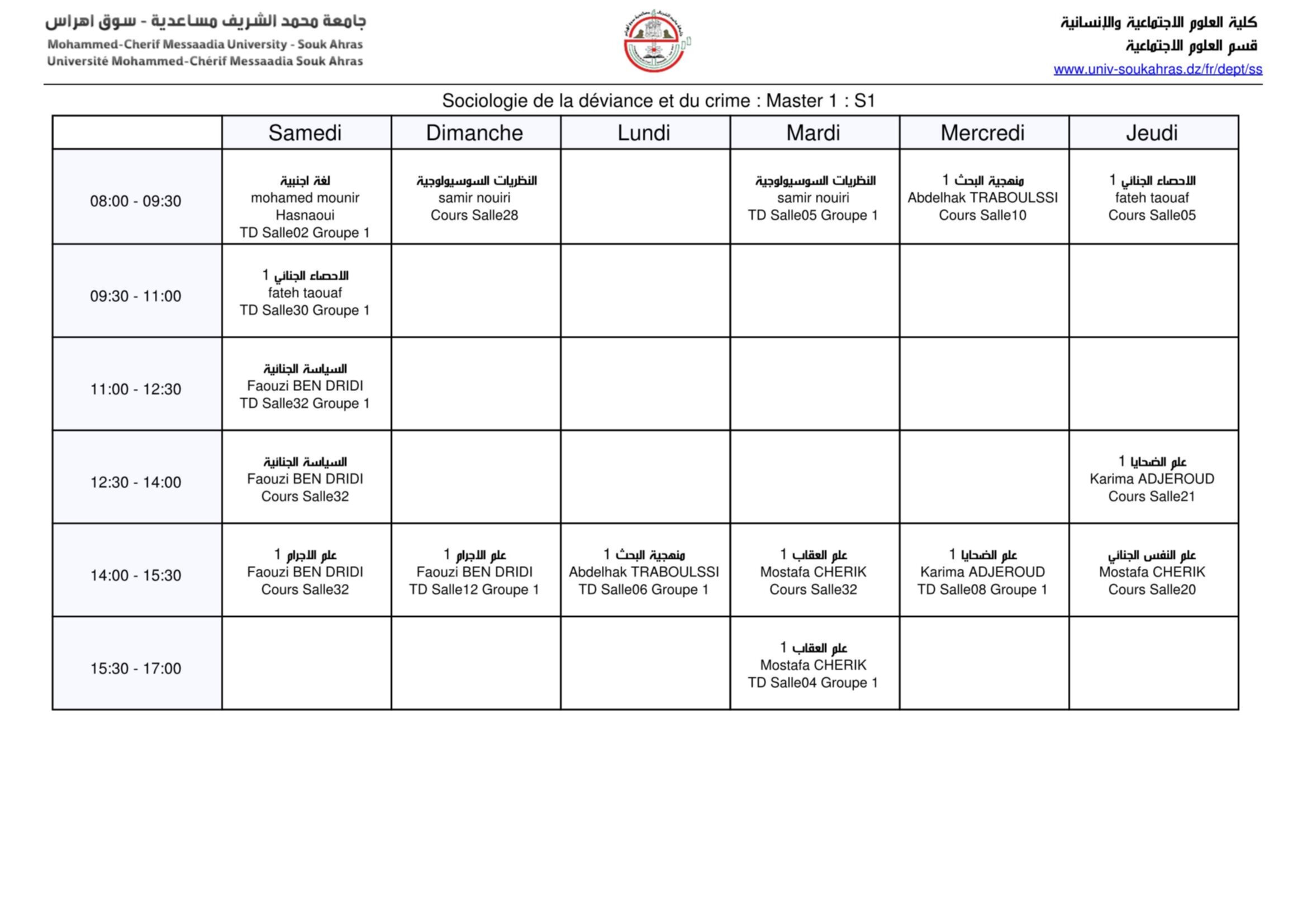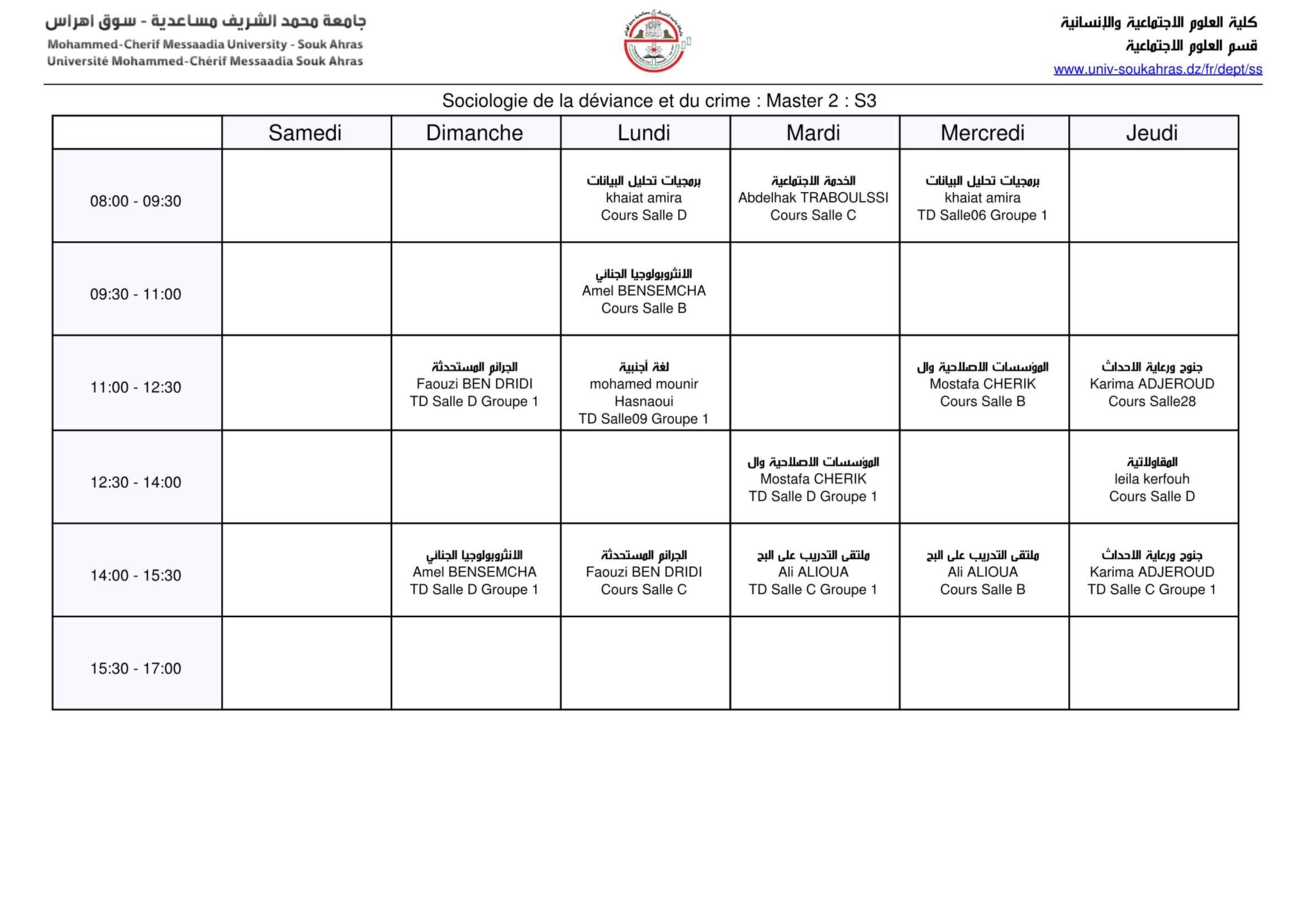 جدول إستعمال الزمن نهائي ماستر علم إجتماع إنحراف و جريمة (s1+ s3) Fri 14 Oct 2022 10:27 Fri 14 Oct 2022 10:38 Sociologie-de-la-deviance-et-du-crime-Master-1-S1Download Sociologie-de-la-deviance-et-du-crime-Master-2-S3Download