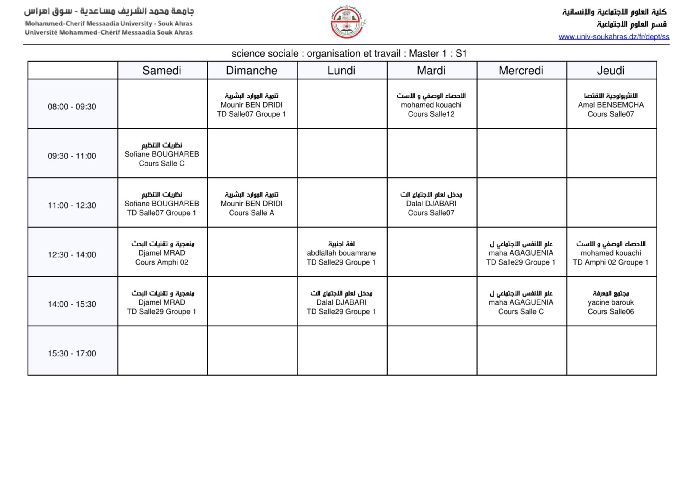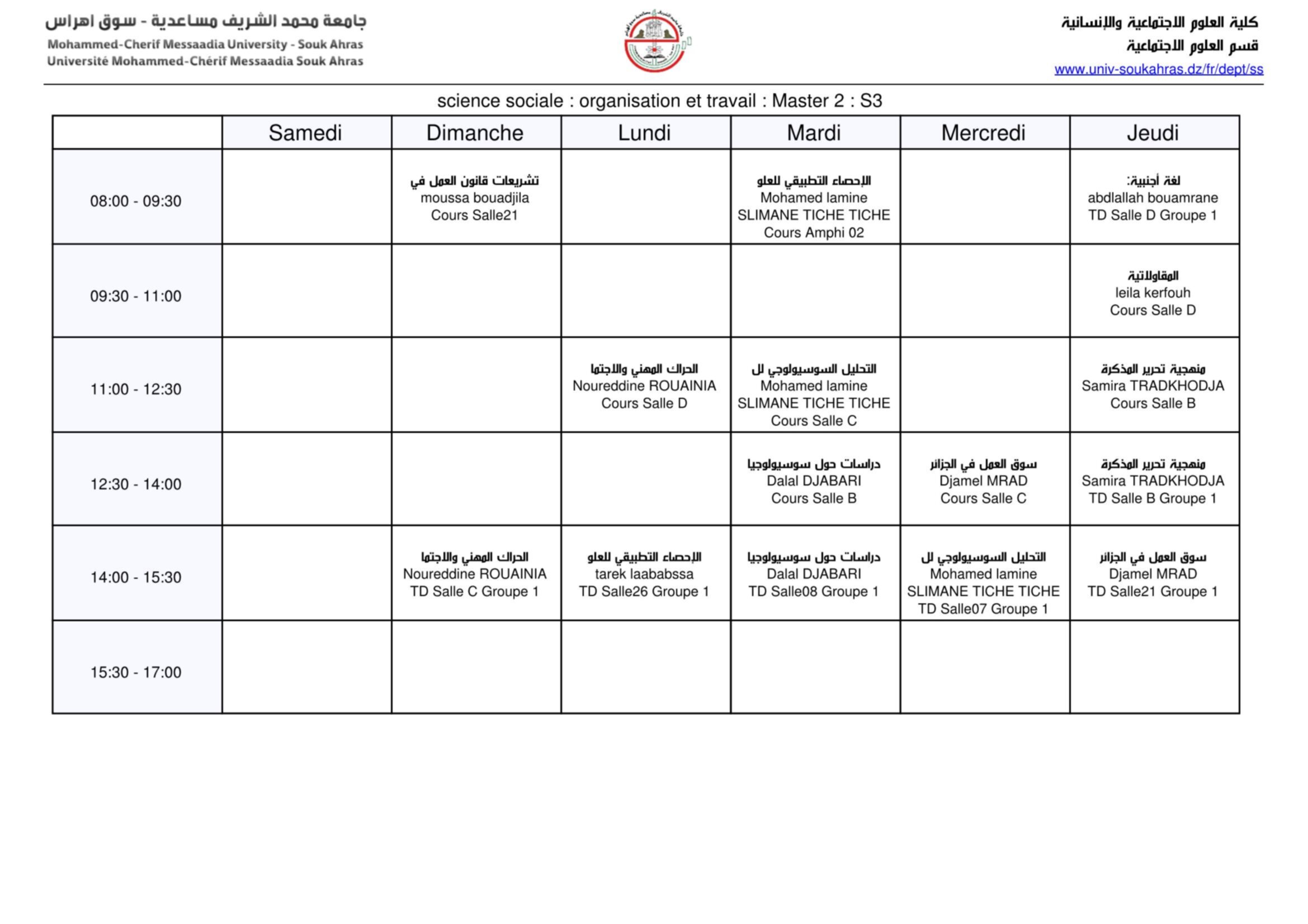 جدول إستعمال الزمن نهائي ماستر علم إجتماع تنظيم وعمل (s1+ s3) Fri 14 Oct 2022 10:29 Fri 14 Oct 2022 10:44 sociologie-organisation-et-travail-Master-1-S1Download sociologie-organisation-et-travail-Master-2-S3Download