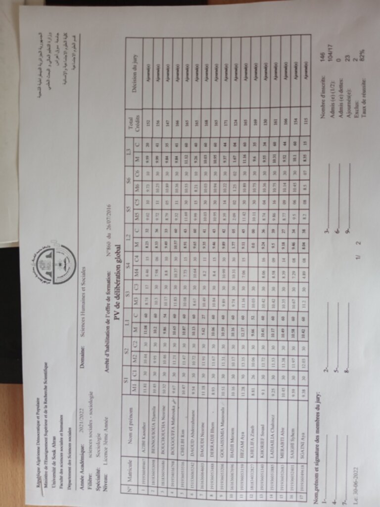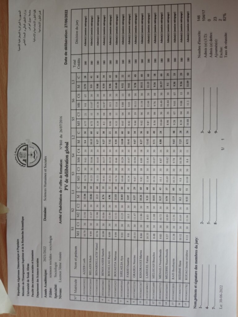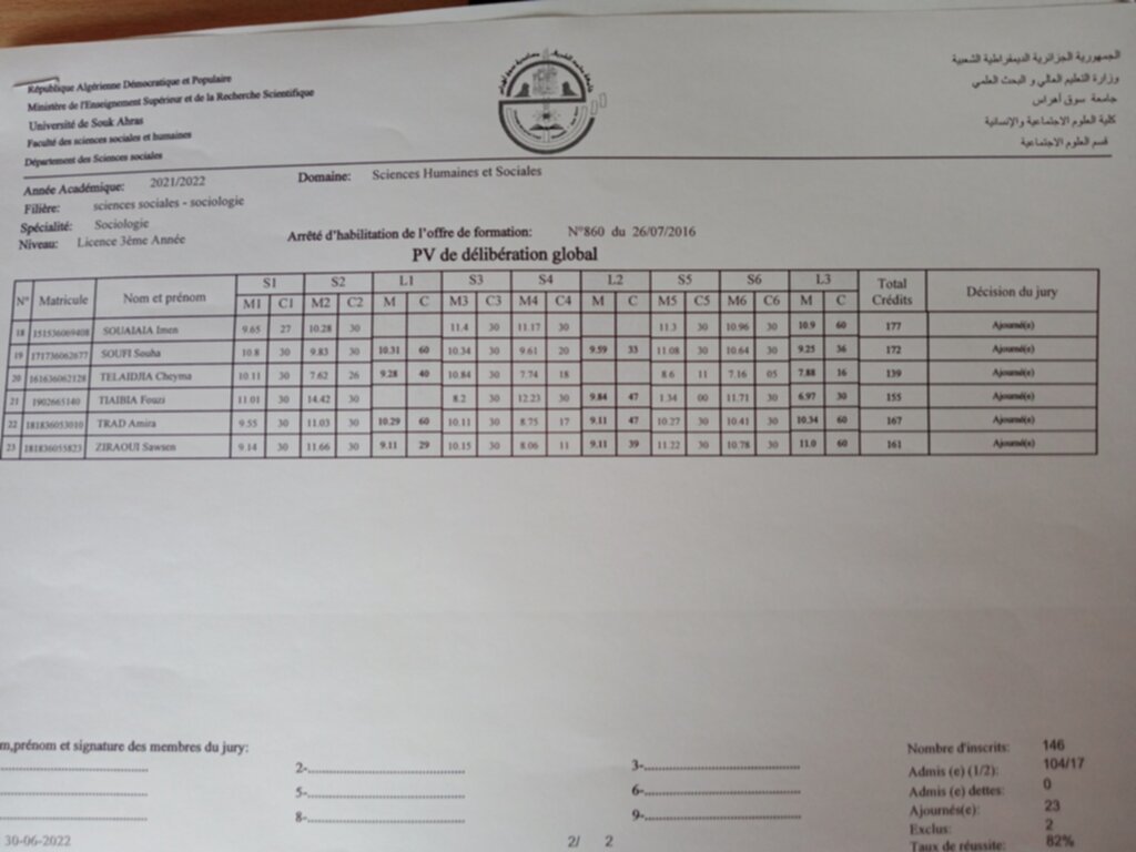 علوم إجتماعية : مداولات نهائية سنة ثالثة إستدراك + معيدين