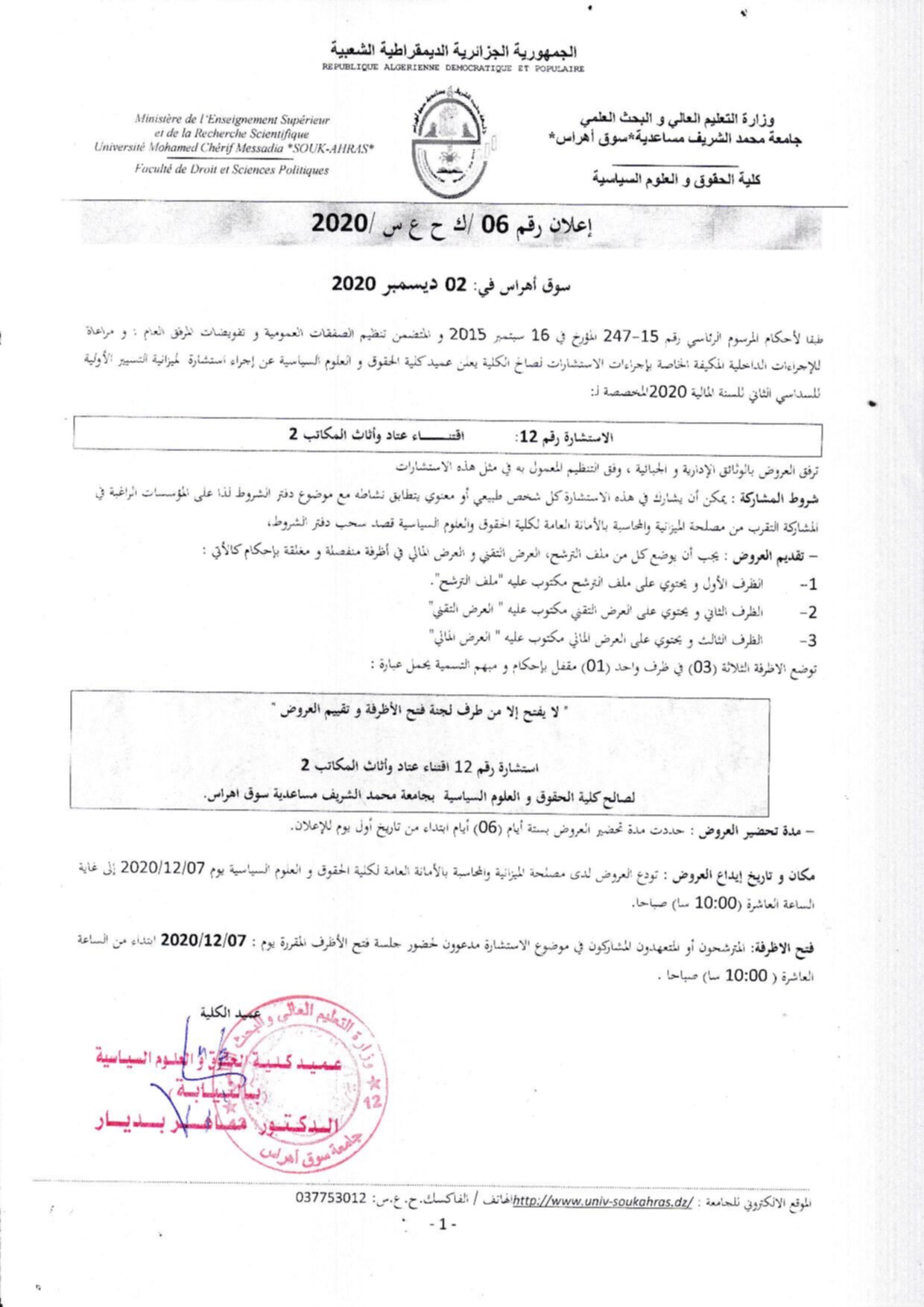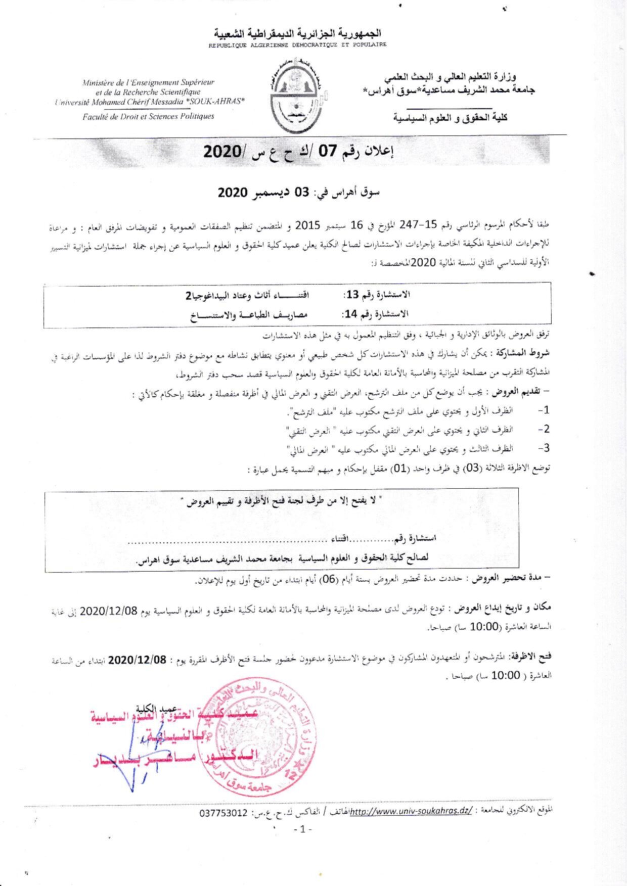 كلية الحقوق و العلوم السياسية : اعلان عن استشارات