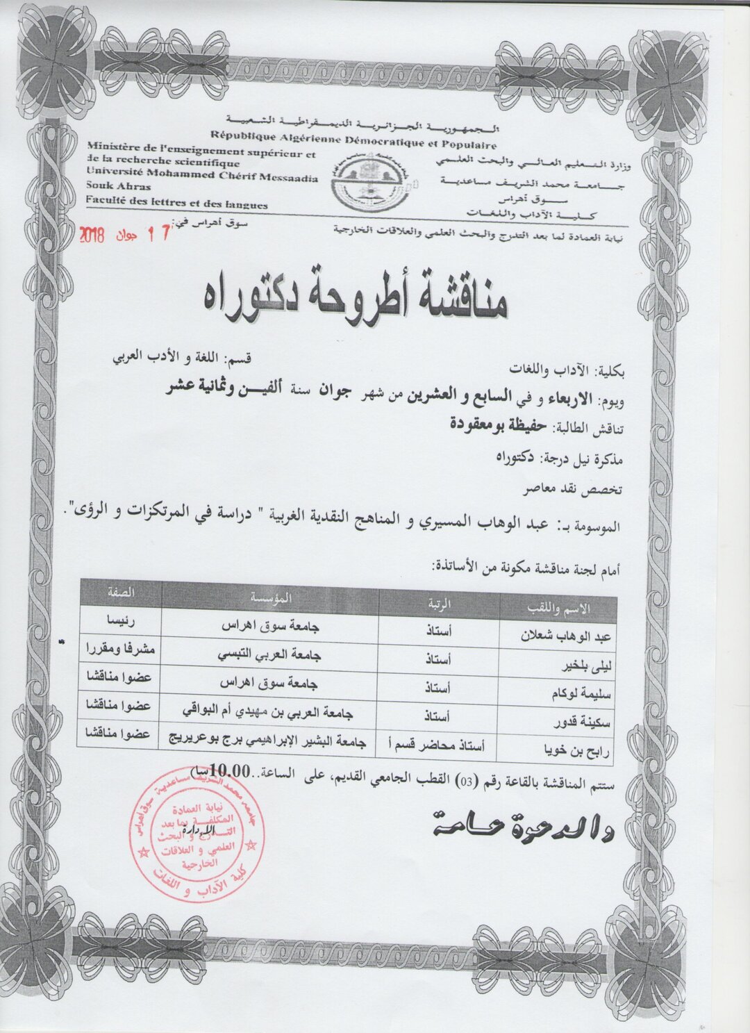 كلية الآداب و اللغات – مناقشة أطروحة دكتوراه