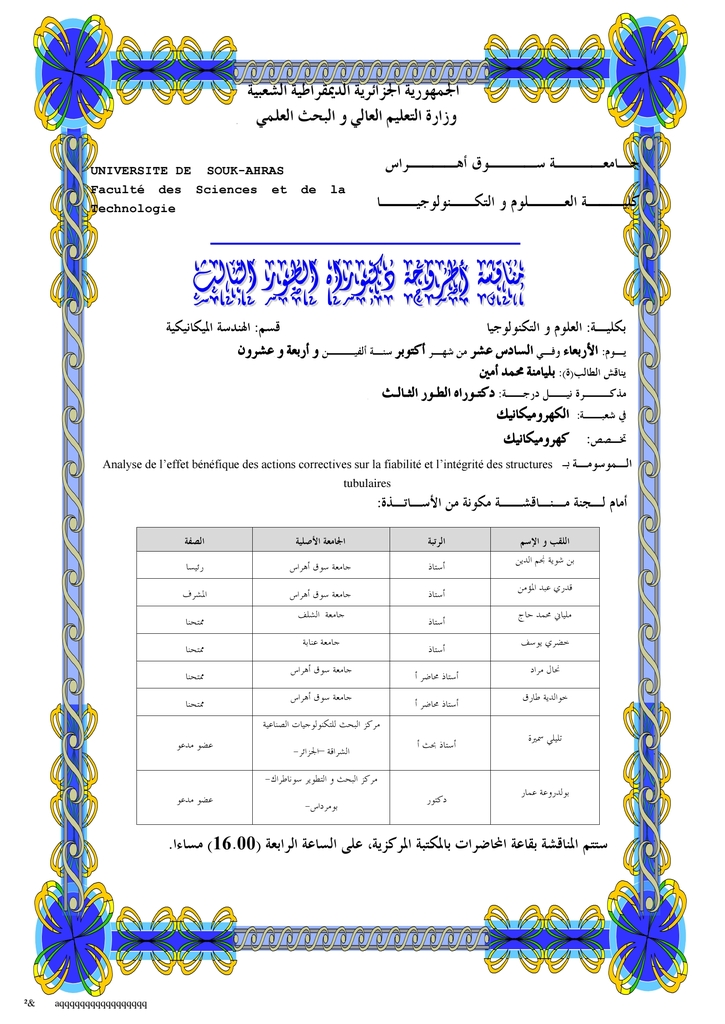 Announcement of the PhD Thesis Defense for Third Cycle Student, Belyamena Mohamed Amin Thu 10 Oct 2024 08:48 Thu 10 Apr 2025 09:26