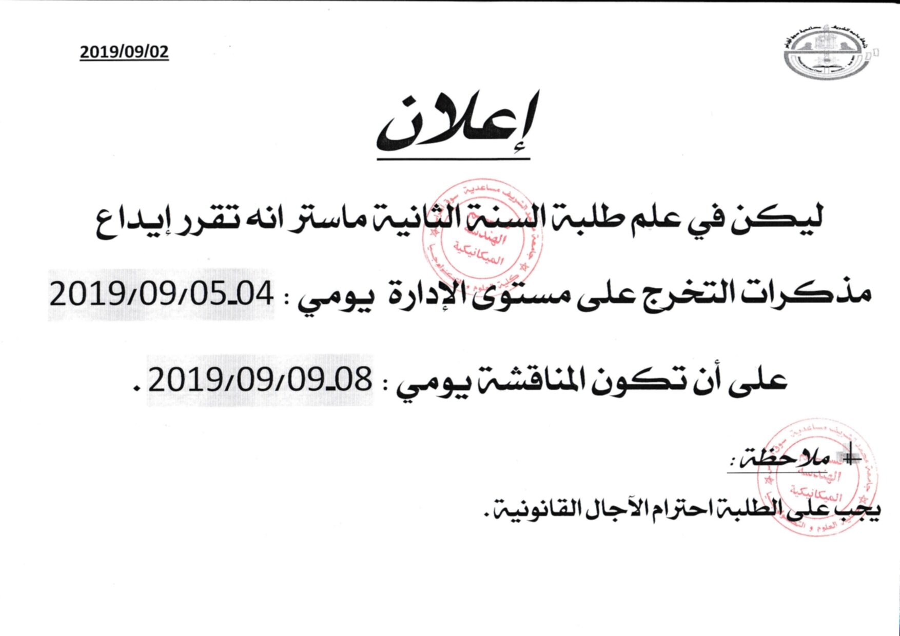 قسم الهندسة الميكانيكية: رزنامة الاعمال البيداغوجية المتبقية للسنة الجامعية2019/2018