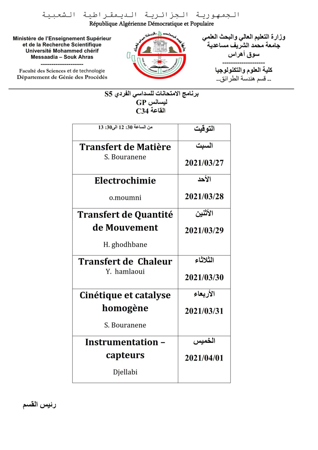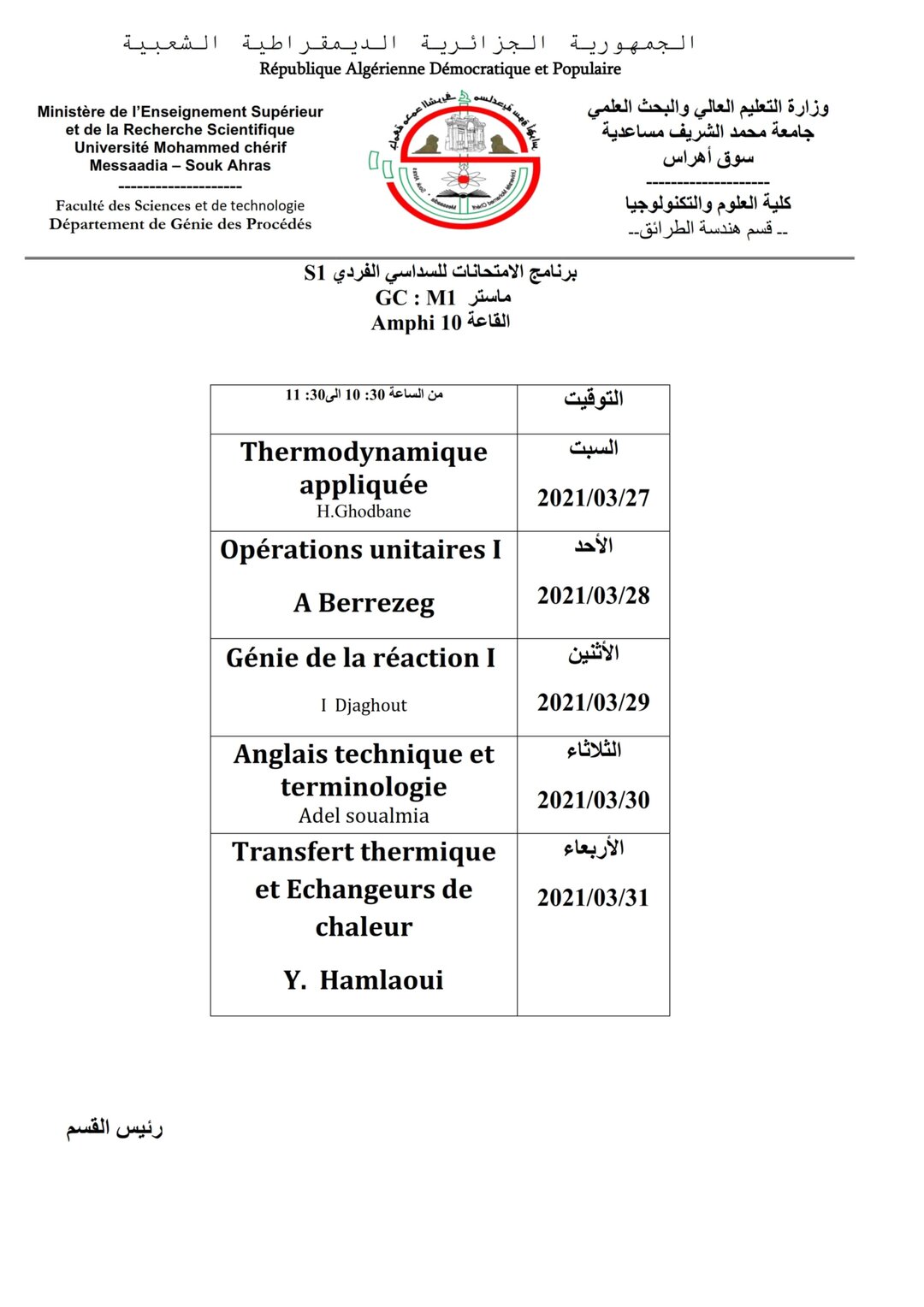 برنامج امتحانات السنة ثالثة و الماستر 1 لقسم هندسة الطرائق