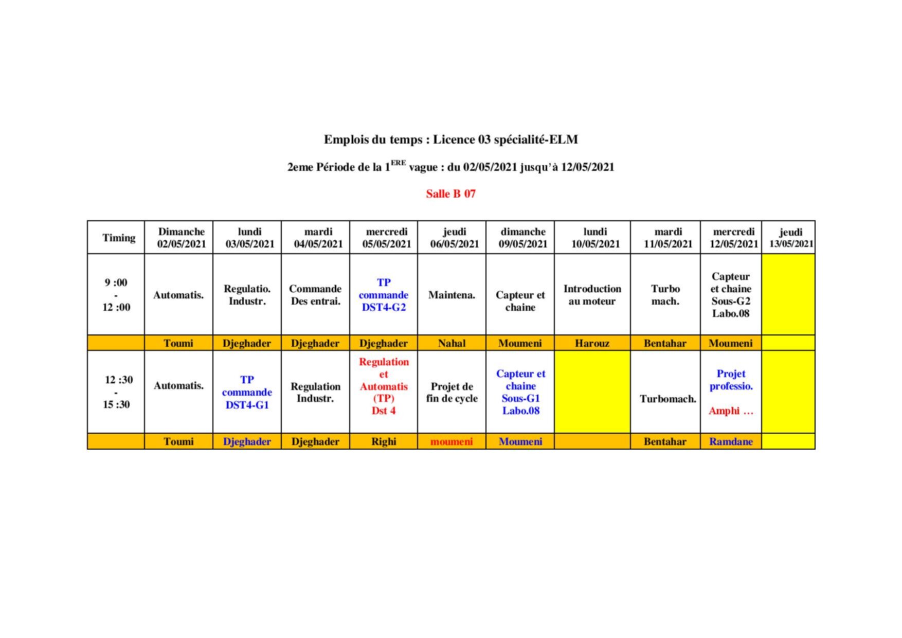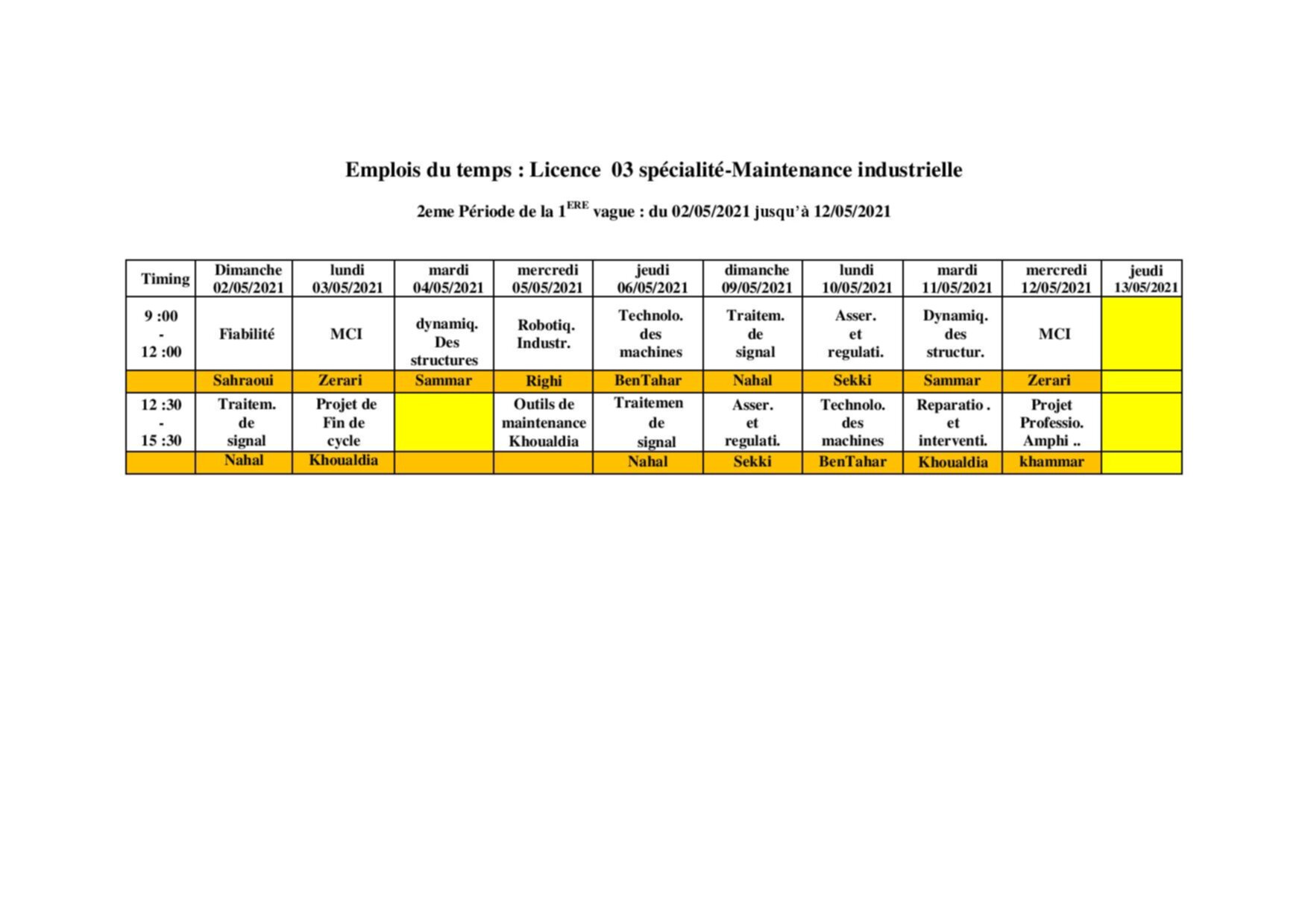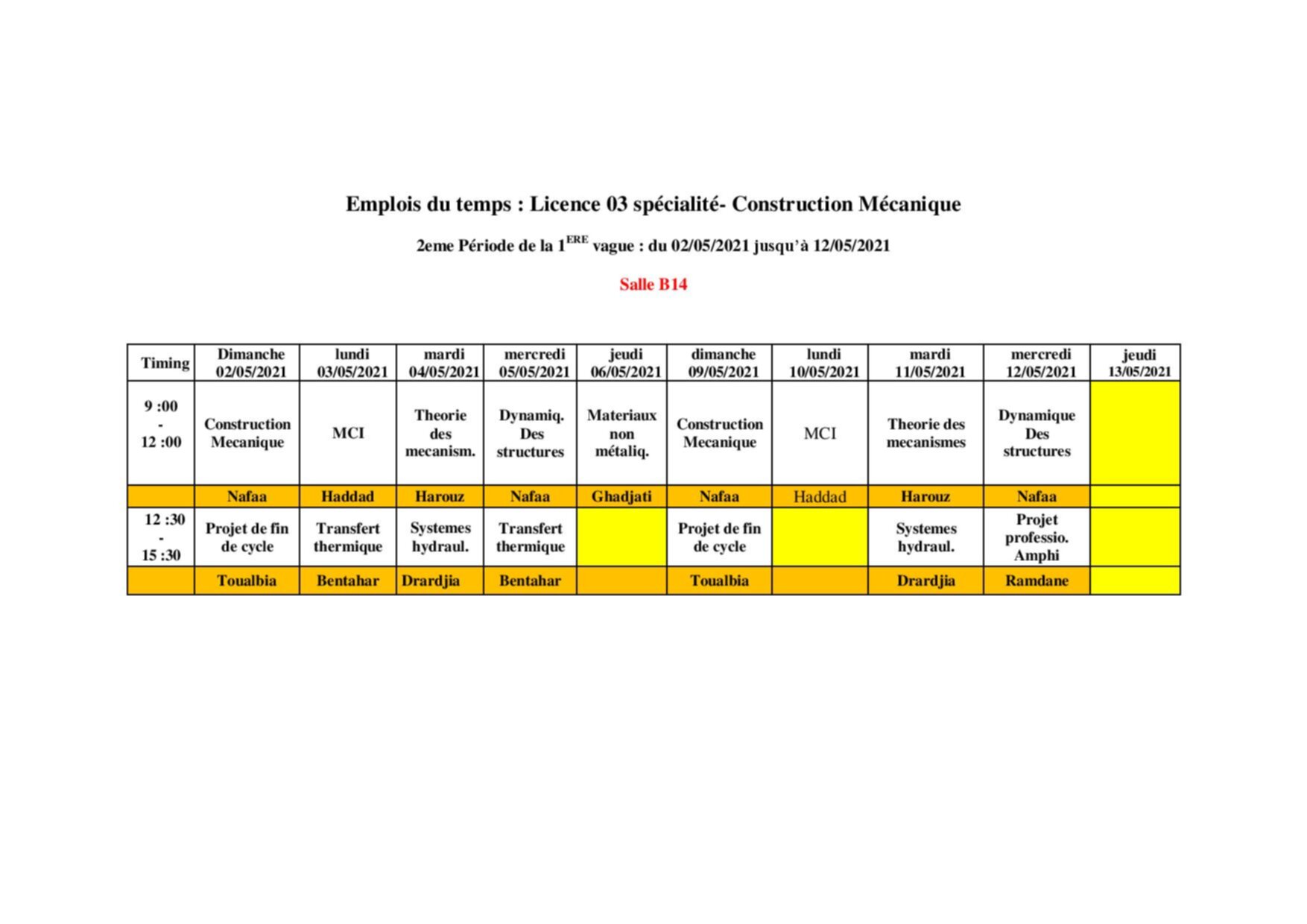 برنامج التدريس الحضوري لقسم الهندسة الميكانيكية لطلبة السنة 3ليسانس جميع التخصصات Fri 30 Apr 2021 14:11 برنامج التدريس الحضوري لقسم الهندسة الميكانيكية لطلبة السنة 3ليسانس لجميع التخصصات (انشاء ميكانيكي – صيانة صناعية و الاليكتروميكانيك)