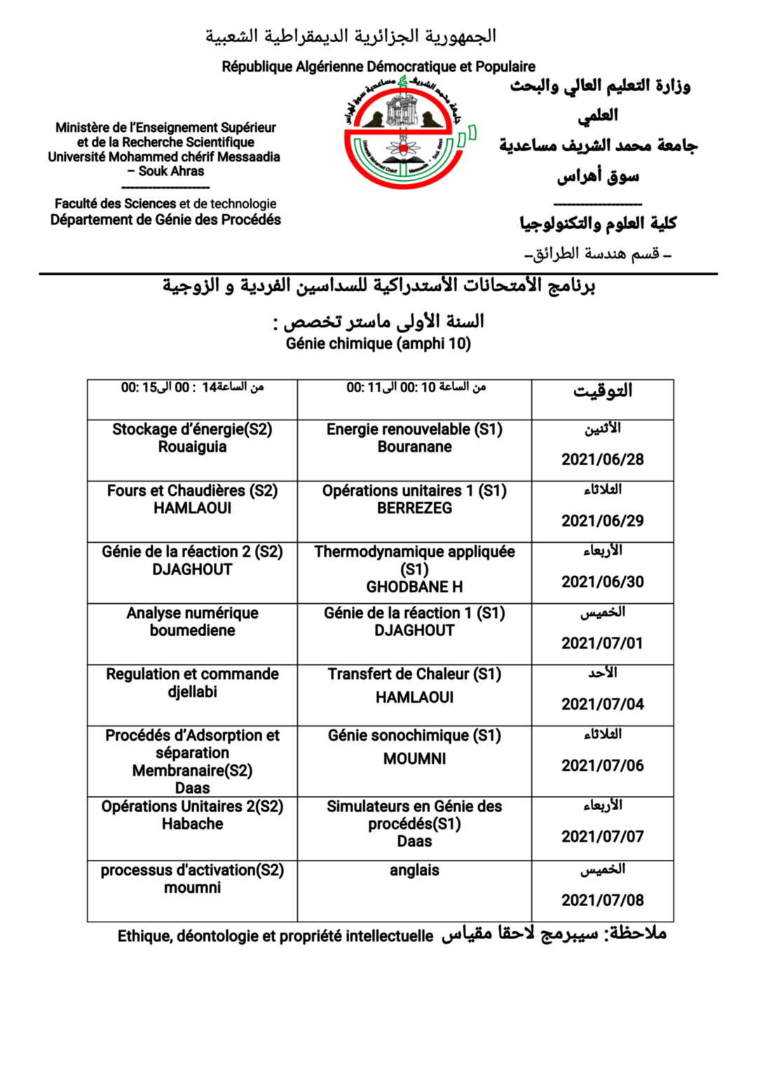 الامتحانات الاستدراكية لقسم هندسة الطرائق