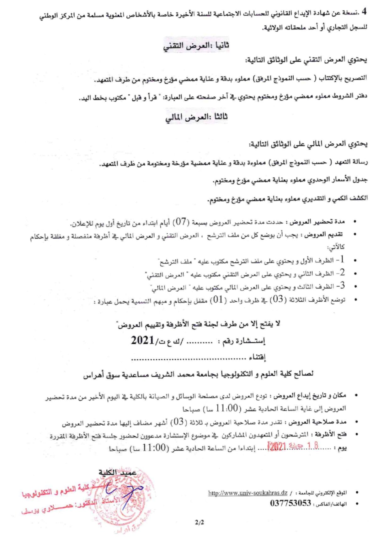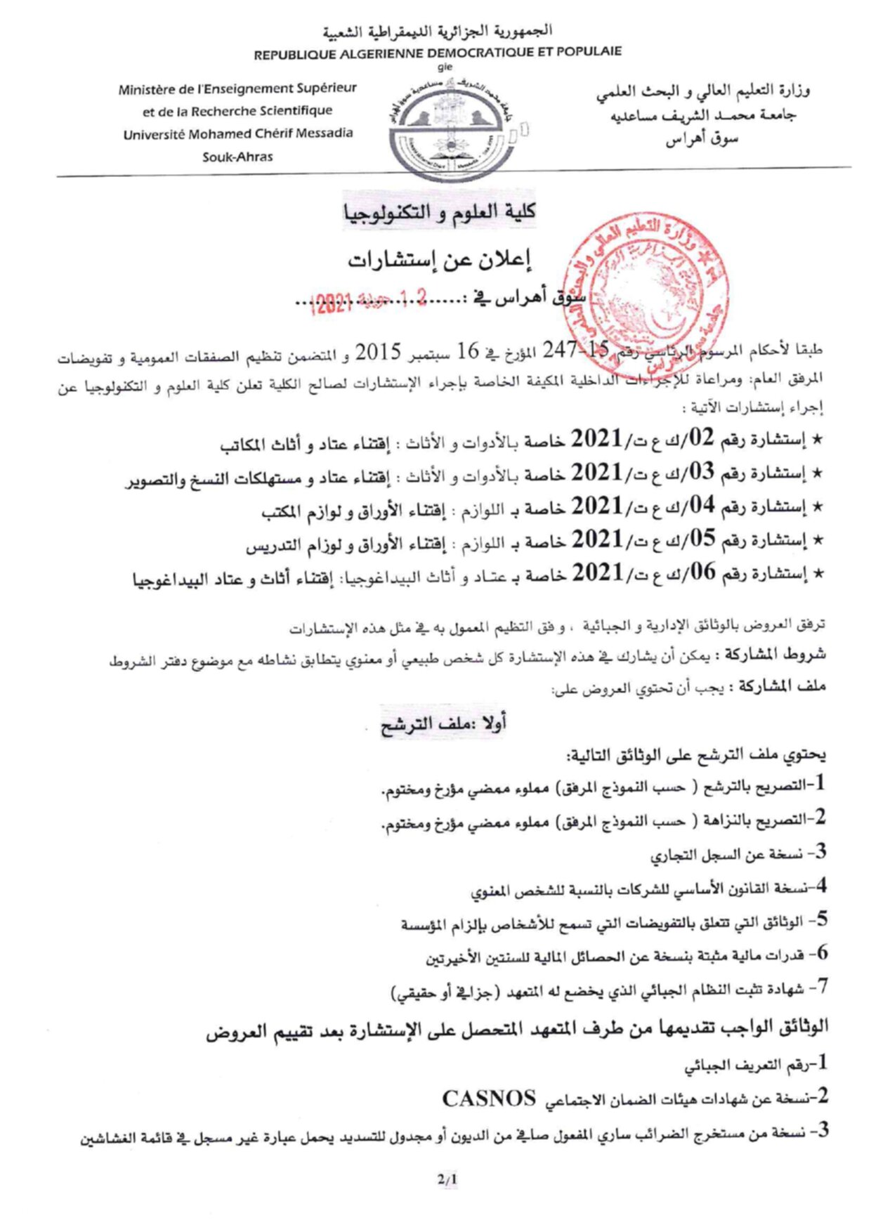 كلية العلوم و التكنولوجيا : اعلان عن استشارات