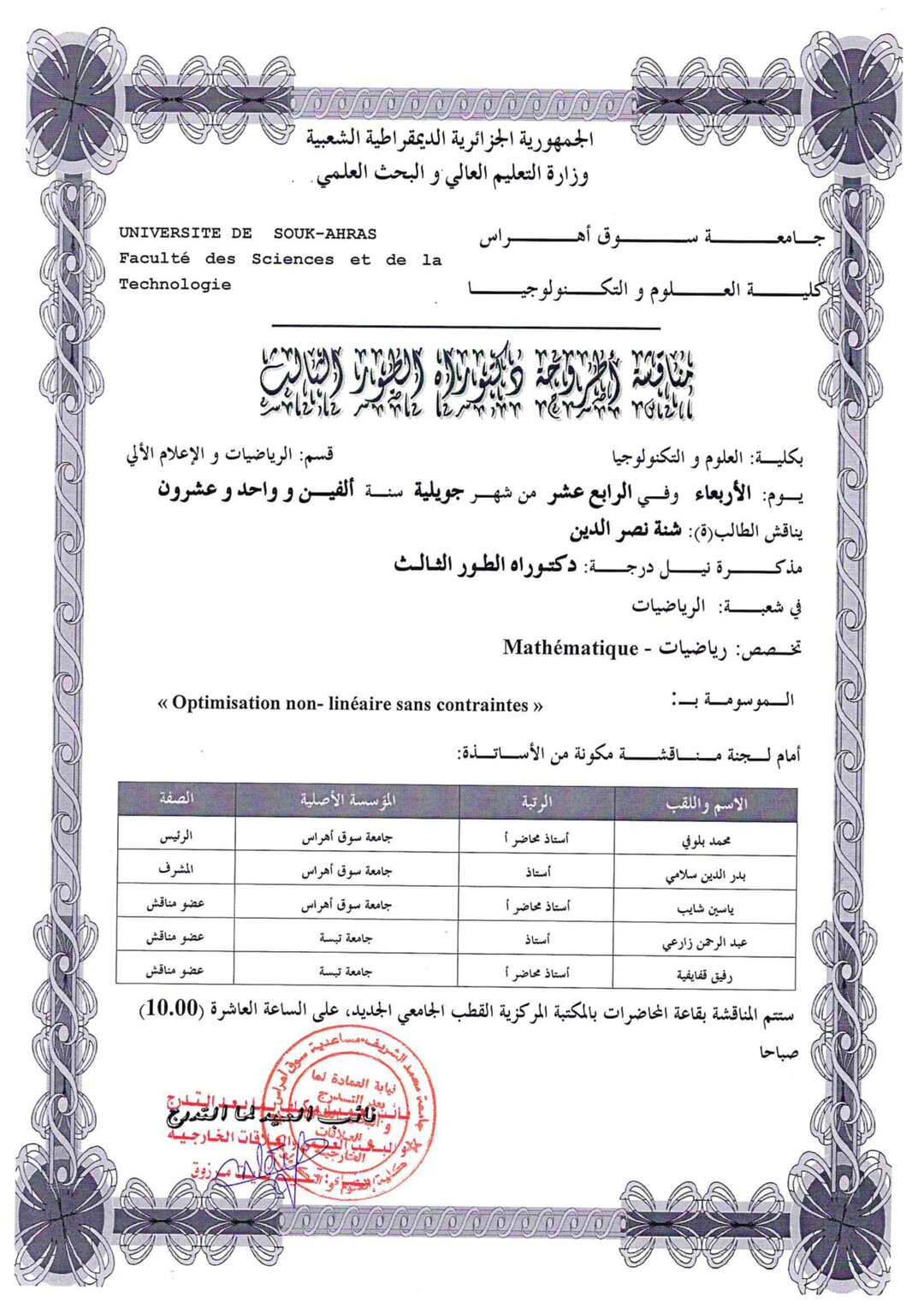 مناقشة الدوكتوراه الطور الثالث للطالب شنة نصر الدين : 14/07/2021 Tue 13 Jul 2021 07:50 Tue 13 Jul 2021 07:53