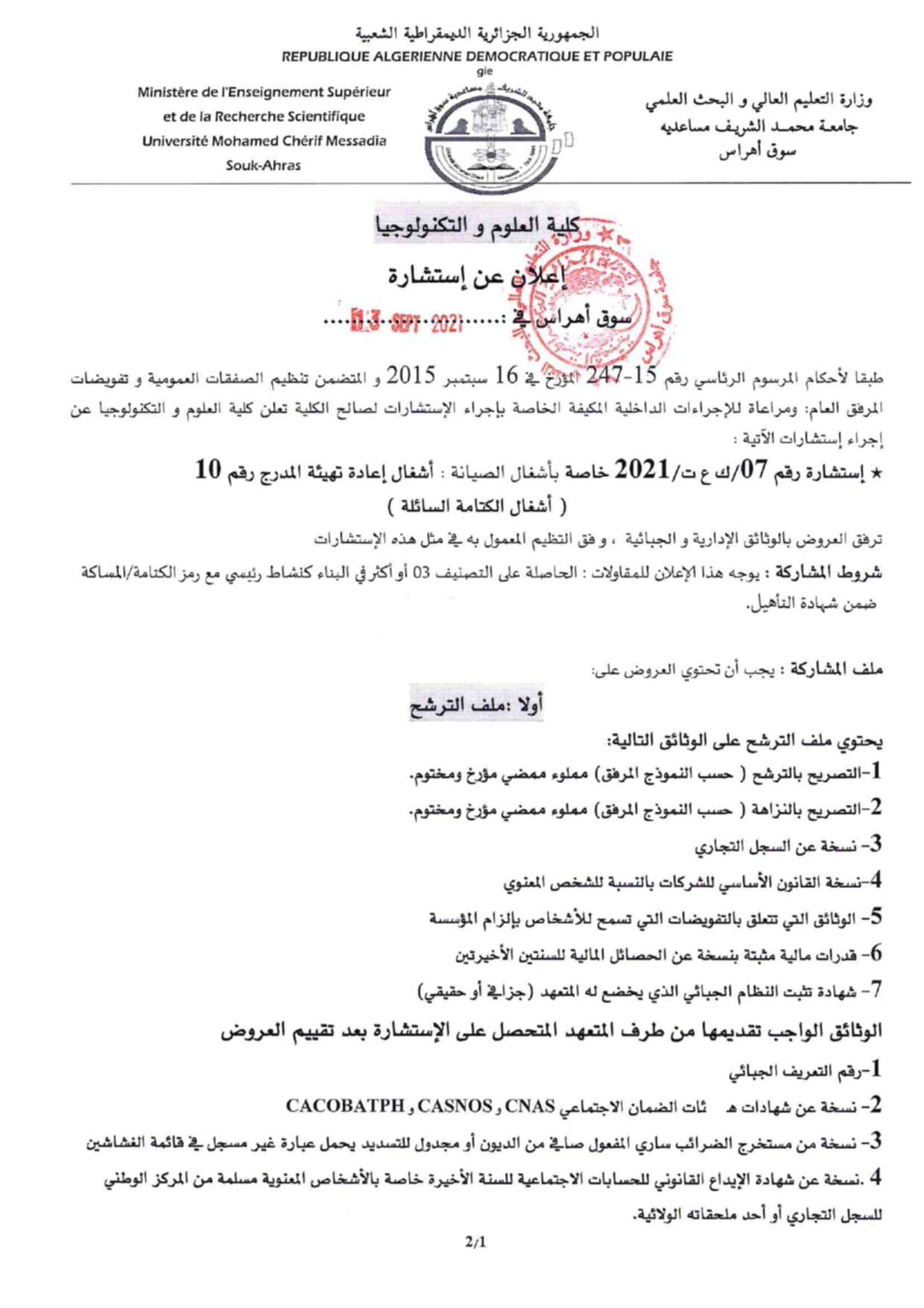 كلية العلوم و التكنولوجيا : إعلان عن إستشارة رقم : 07