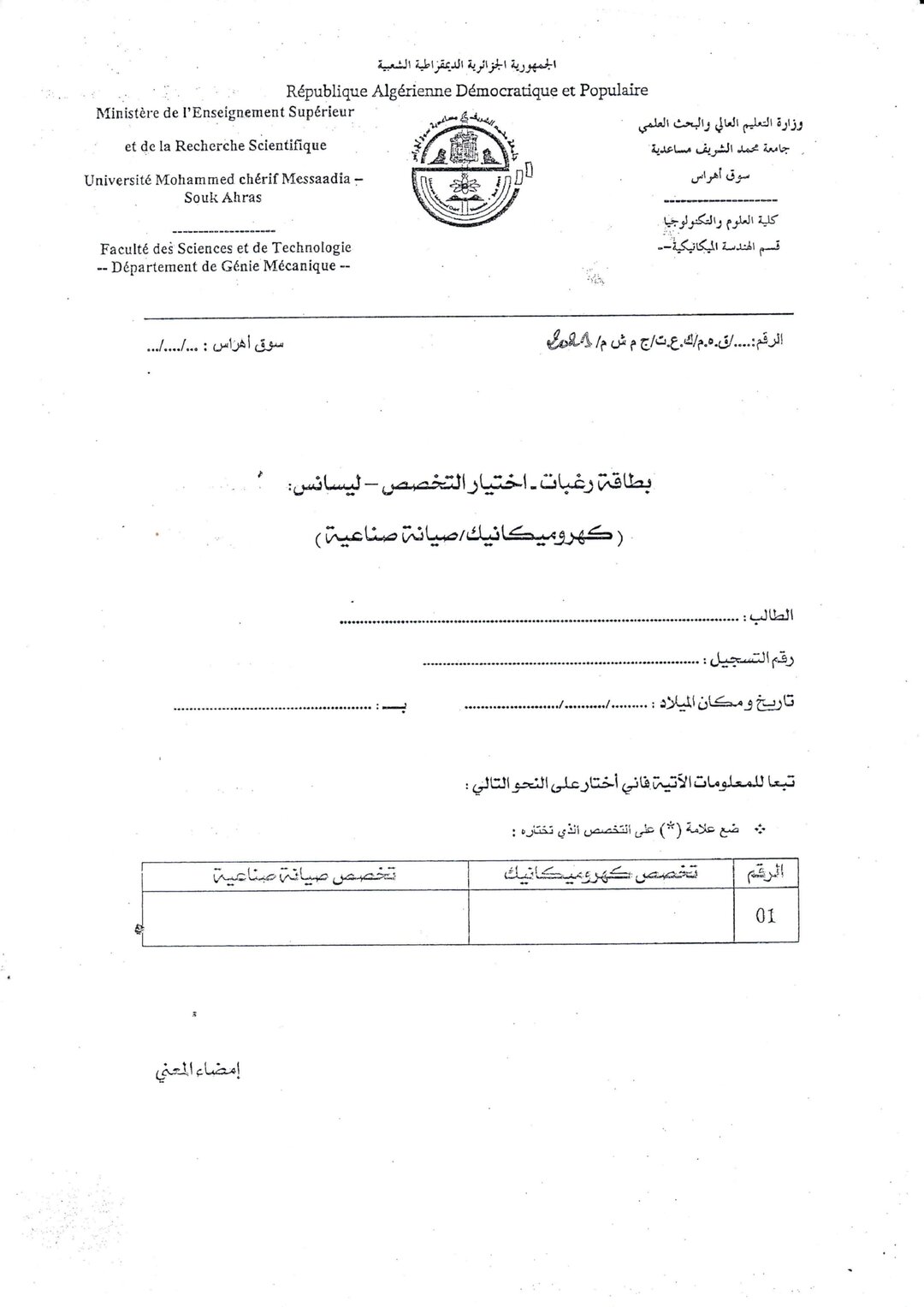 بطاقة الرغبات لقسم الهندسة الميكانيكية Tue 14 Sep 2021 16:13 يطلب من طلبة السنة الثانية للناجحين الى السنة الثالثة هندسة ميكانيكية ملئ بطاقة الرغبات المرفقة بهذا الاعلان في اجل اقصاه الأحد 19سبتمبر 2021 على الساعة 12زوالا. نسلم بطاقة الرغبات على مستوى القسم او ترسل على الانسان التالي: st.gm@univ-soukahras.dz
