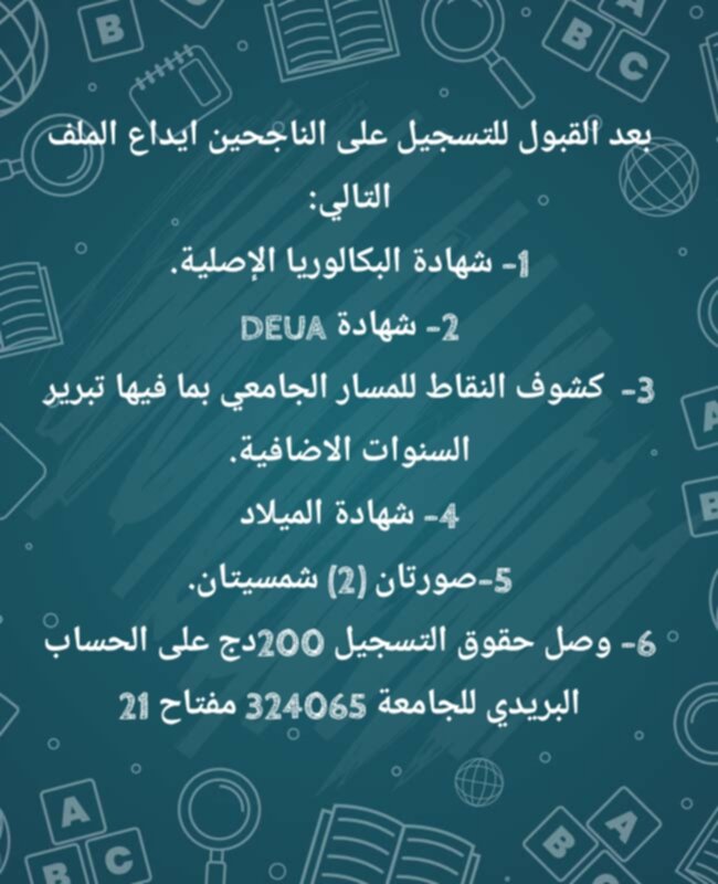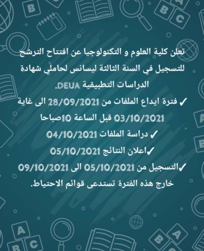 اعلان الترشح للتسجيل في السنة الثالثة ليسانس لحاملي شهادة DEUA Mon 27 Sep 2021 20:52 Mon 27 Sep 2021 20:55