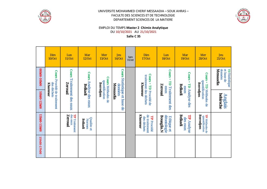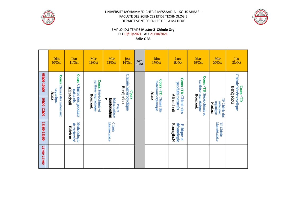 التوزيع الزمني لطلبة للماستر2 قسم علوم المادة