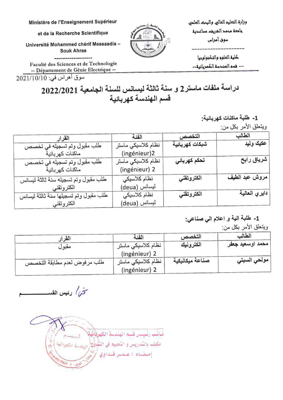 نتائج المترشحين نظام العبور لقسم الهندسة الكهربائية