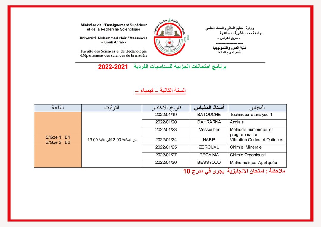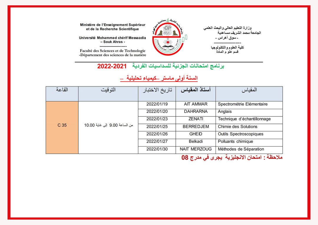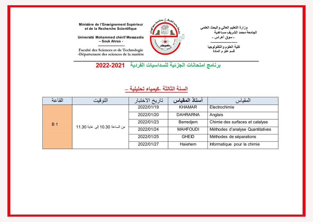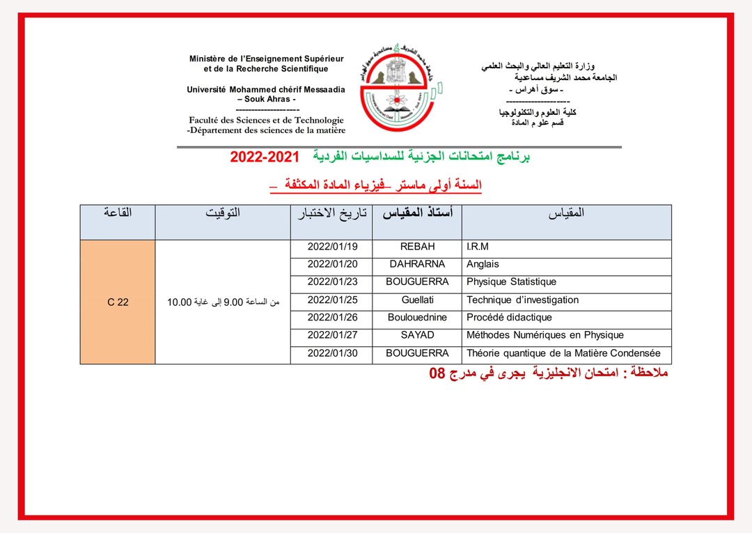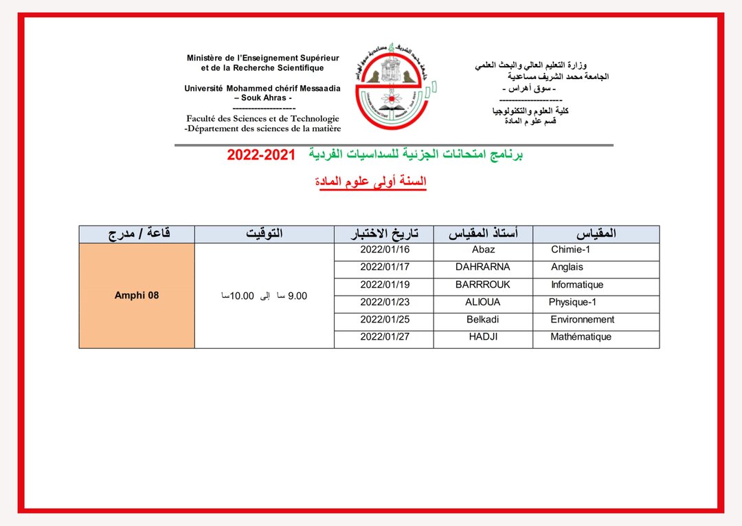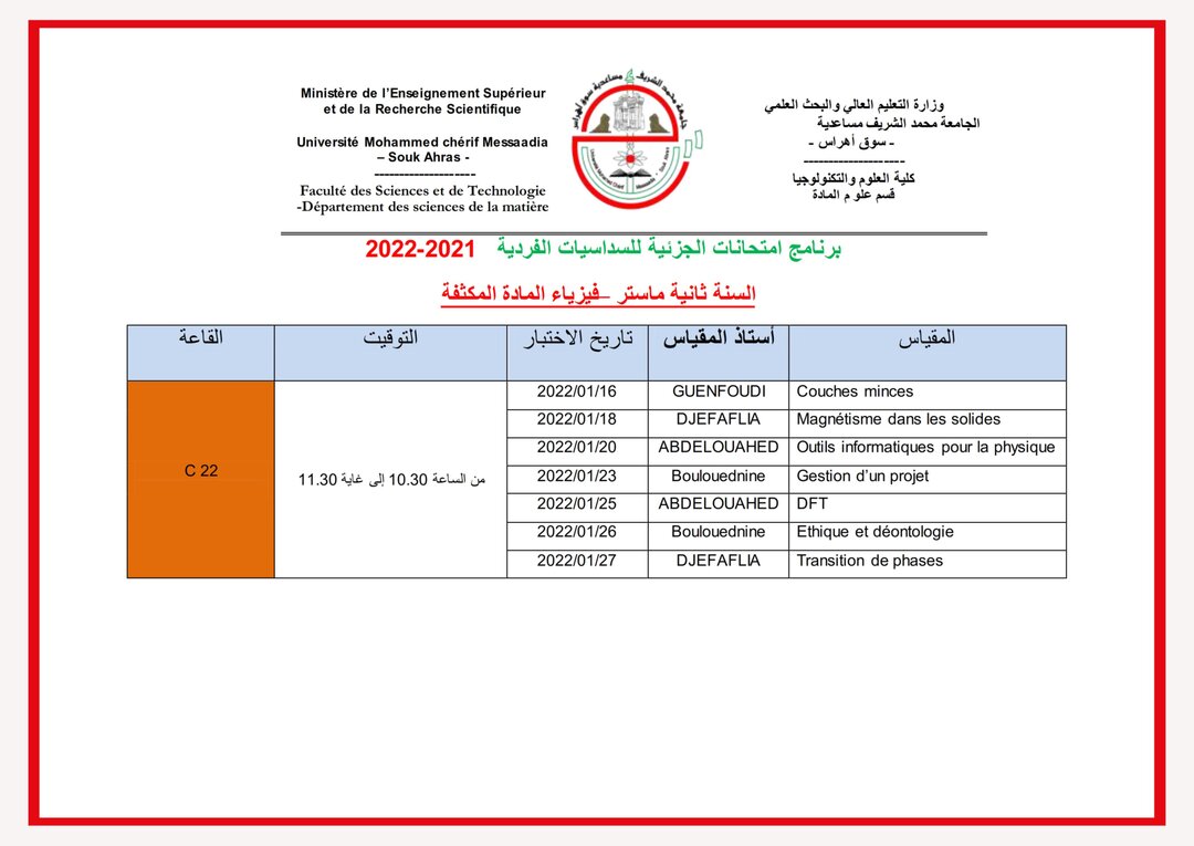 رزنامة الإمتحانات الجزئية للسداسيات الفردية 2021/2022 – قسم علوم المادة