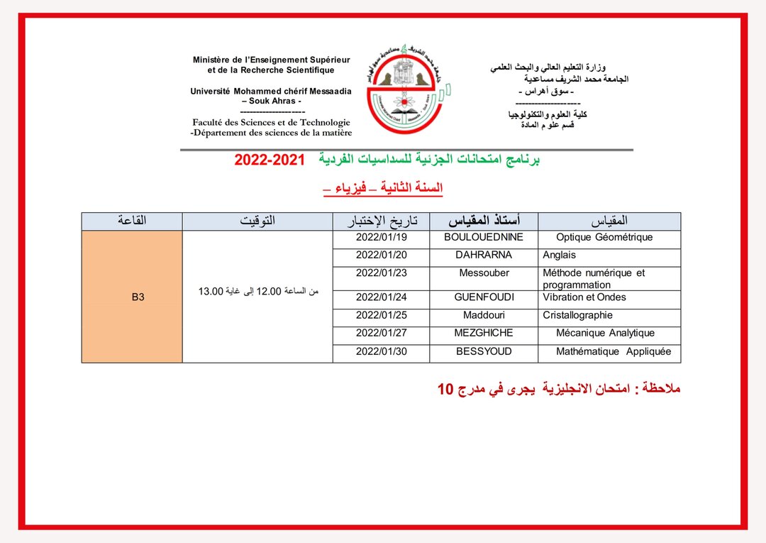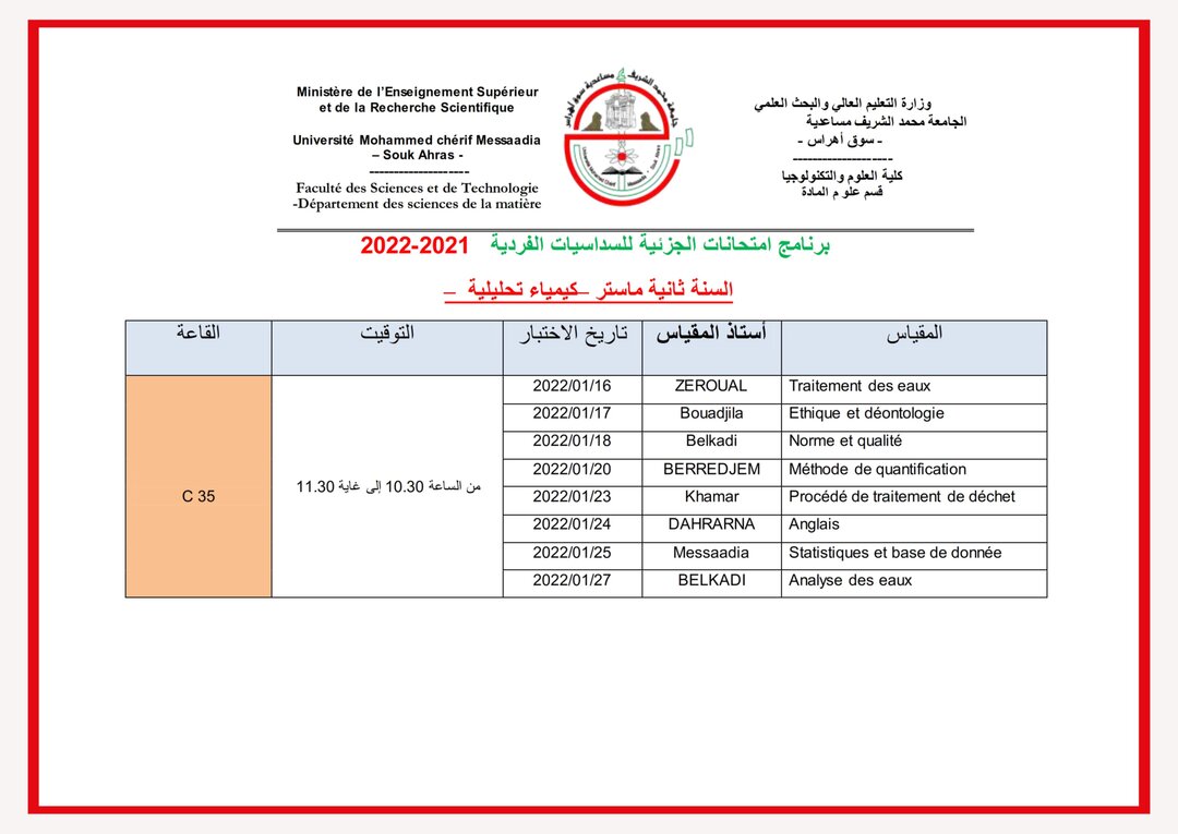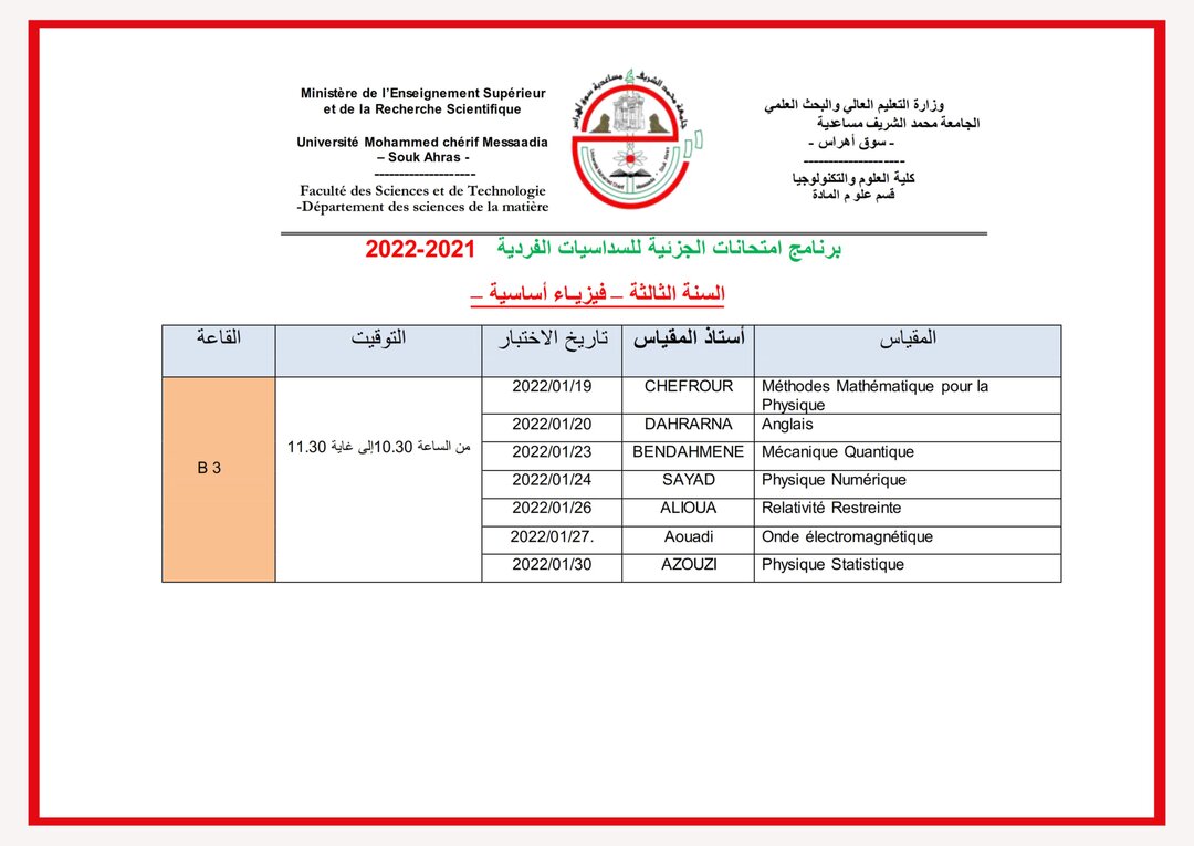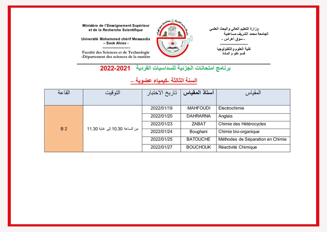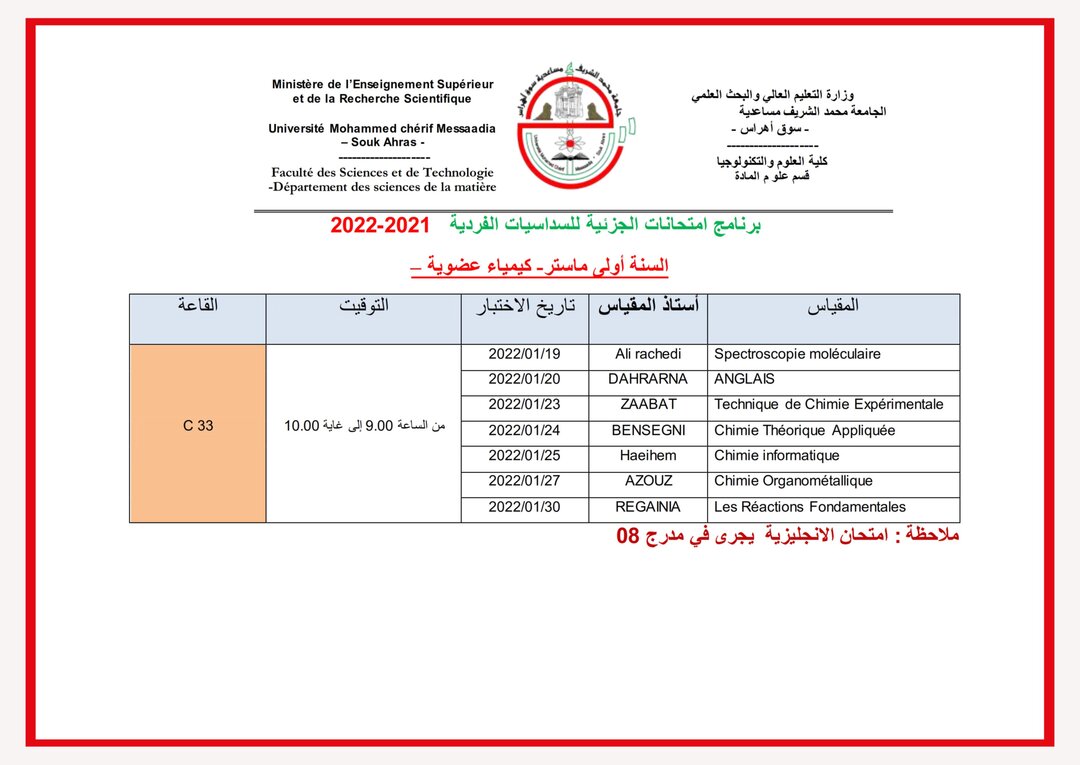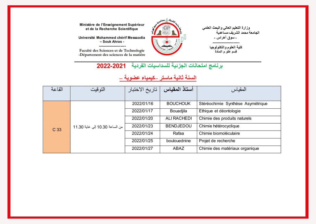 رزنامة الإمتحانات الجزئية للسداسيات الفردية 2021/2022 – قسم علوم المادة