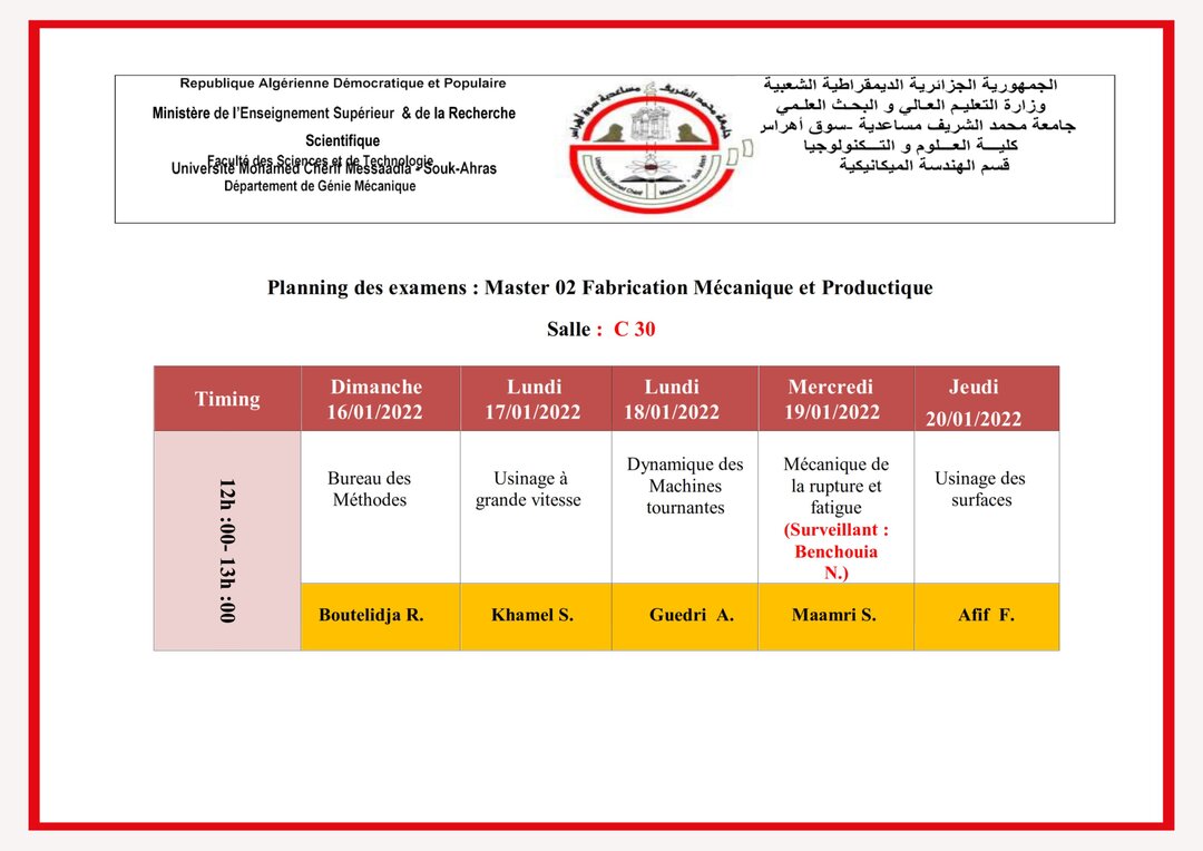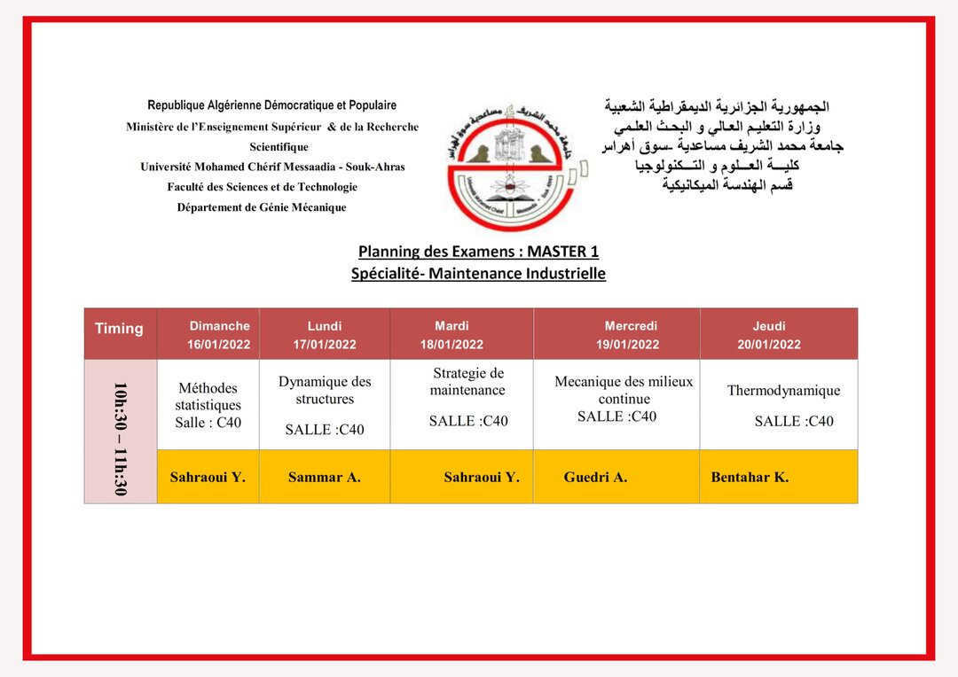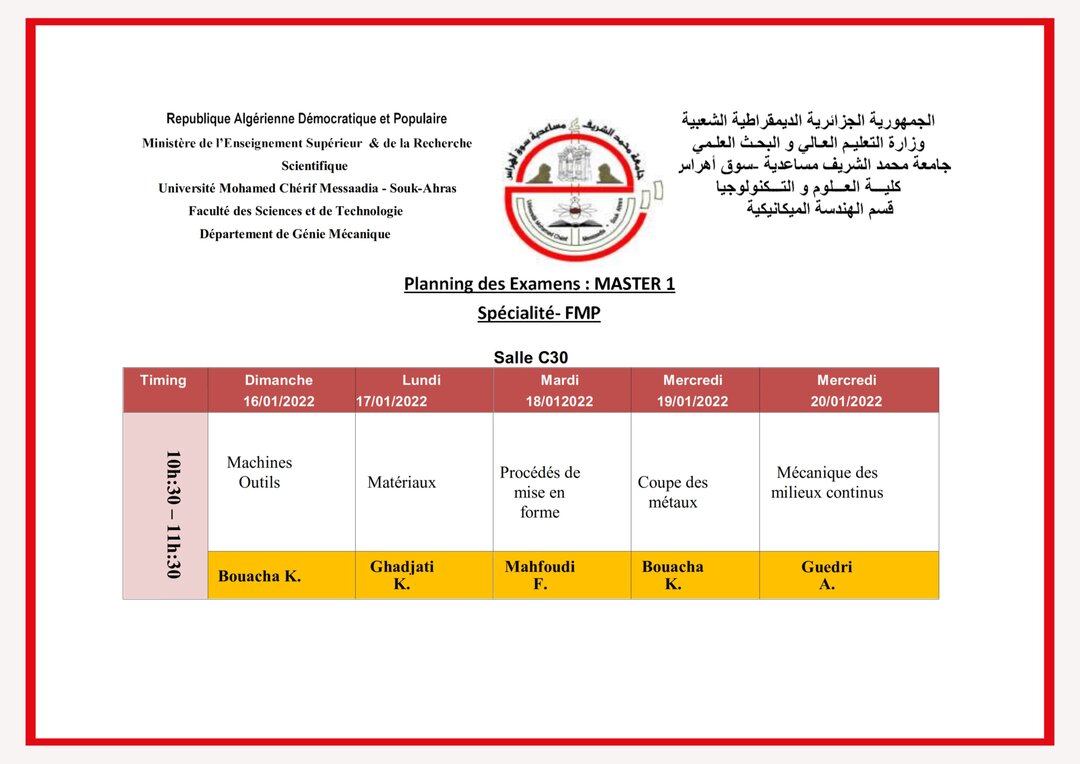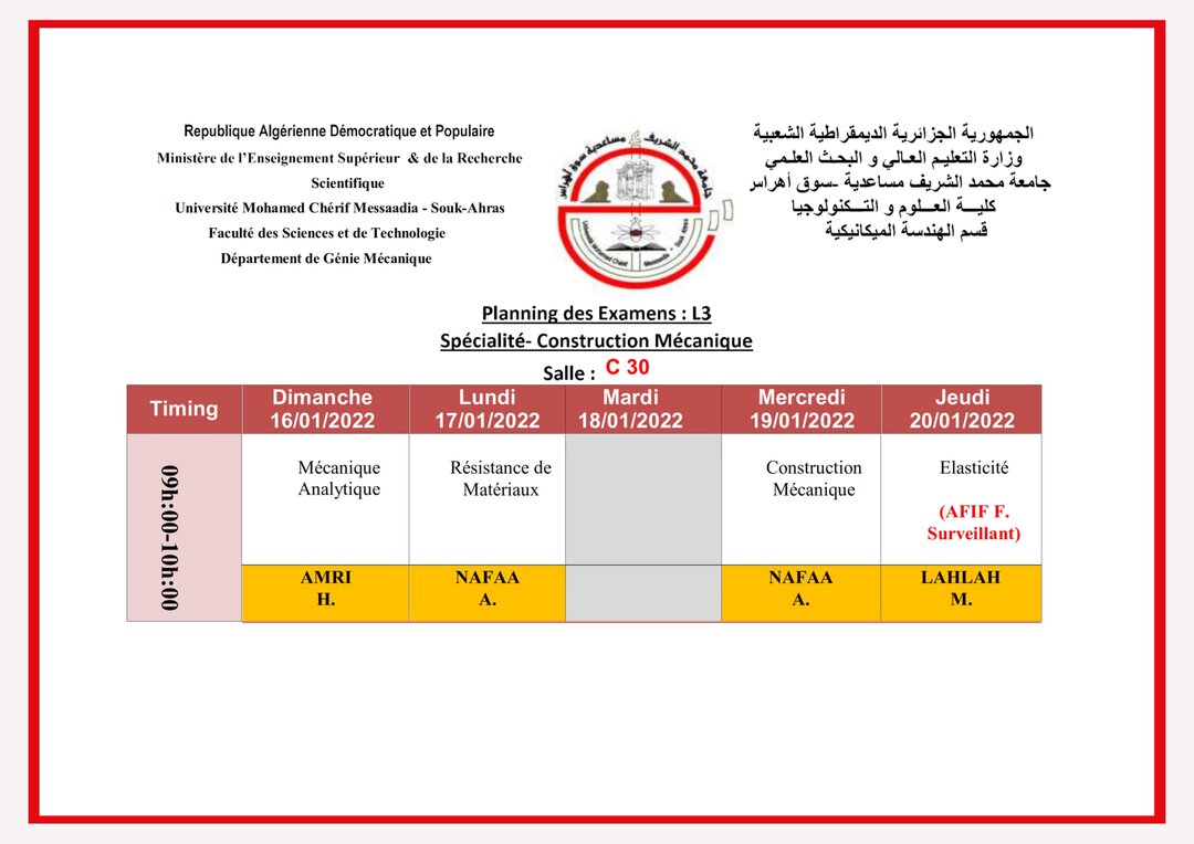 قسم الهندسة الميكانيكية: رزنامة الإمتحانات السداسية الفردية 2021/2022