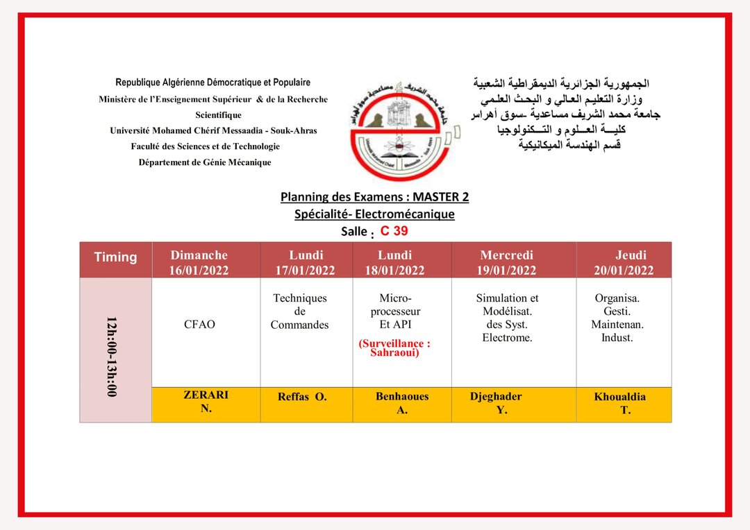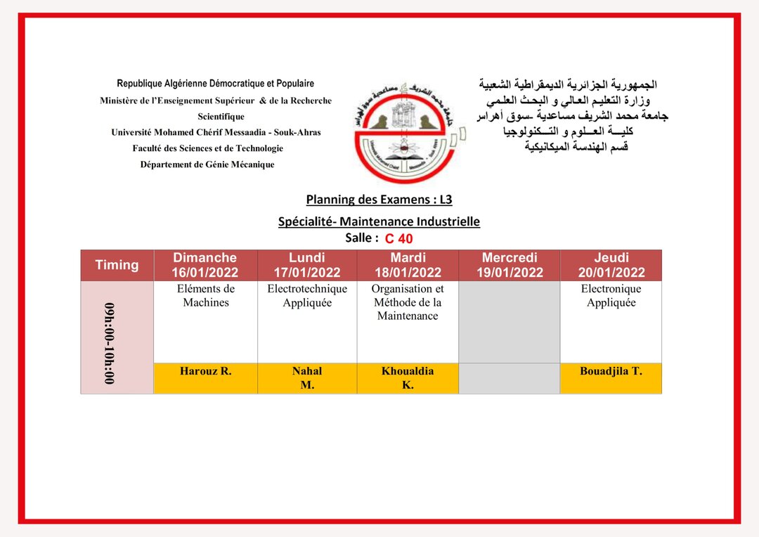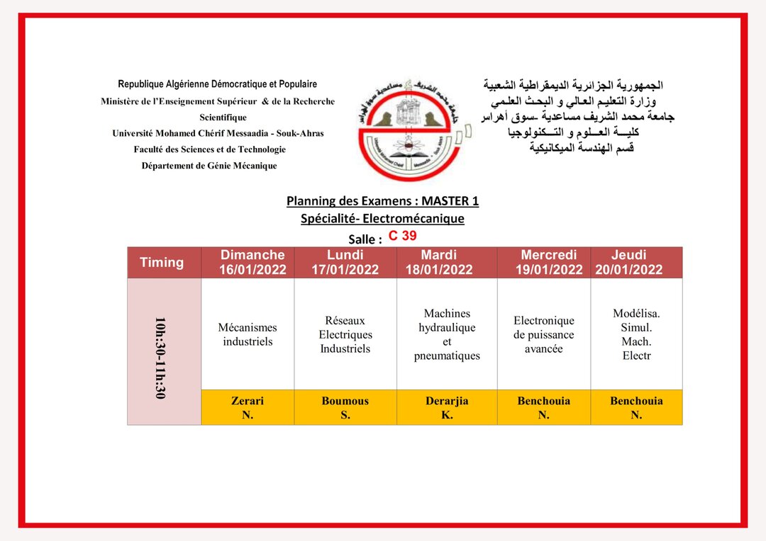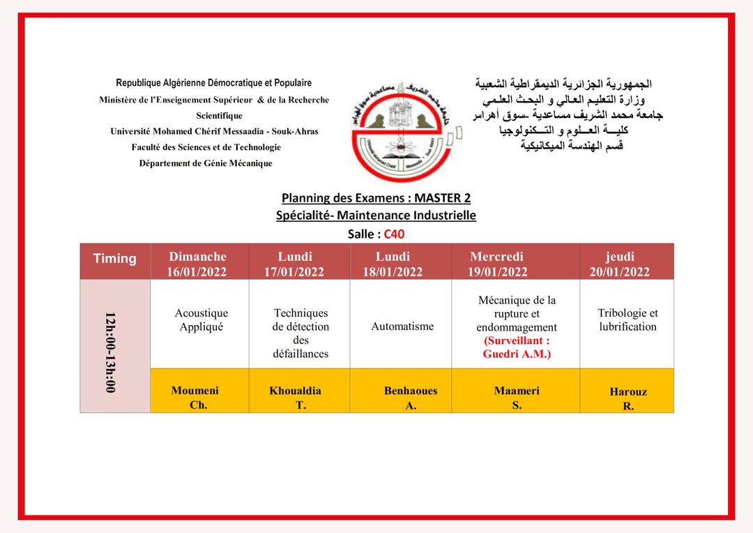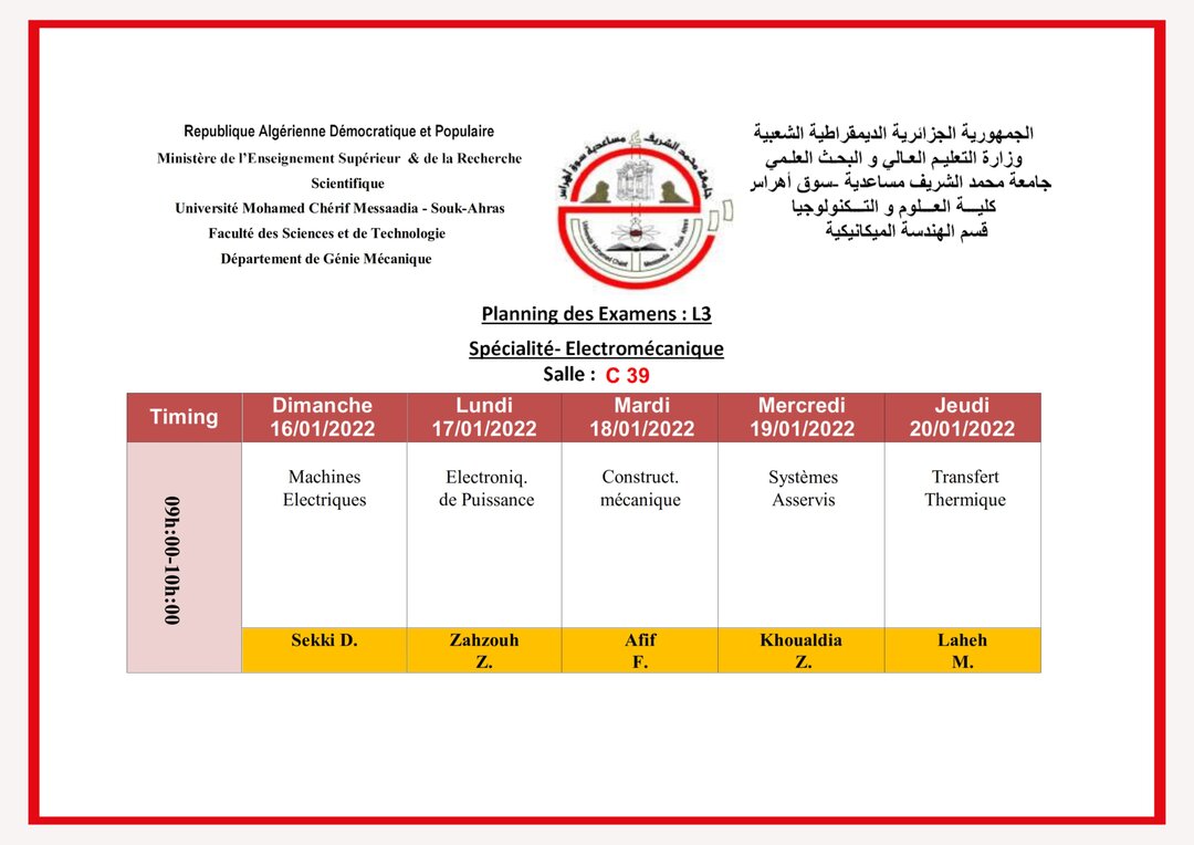 قسم الهندسة الميكانيكية: رزنامة الإمتحانات السداسية الفردية 2021/2022