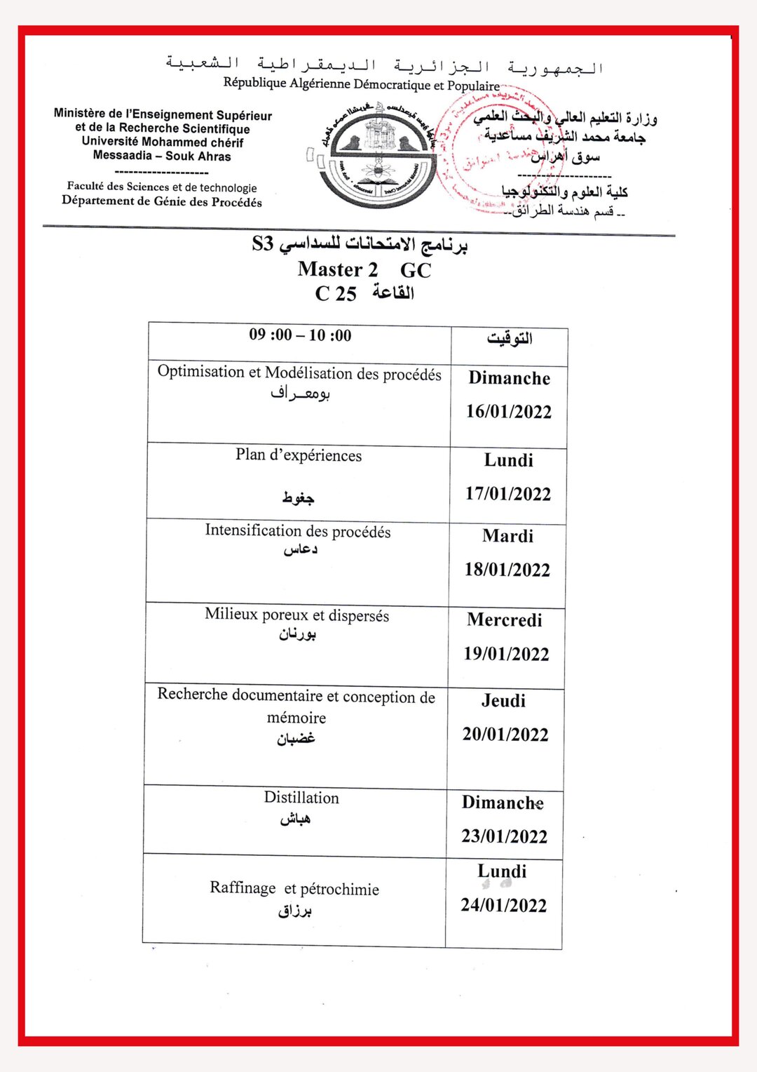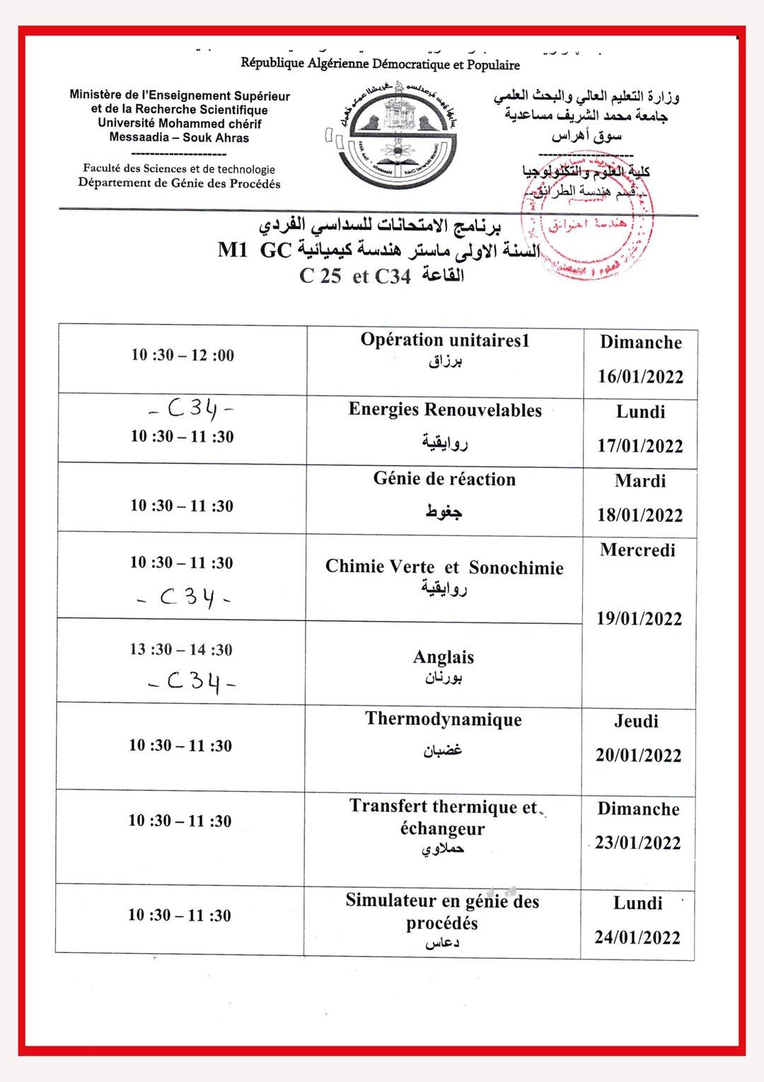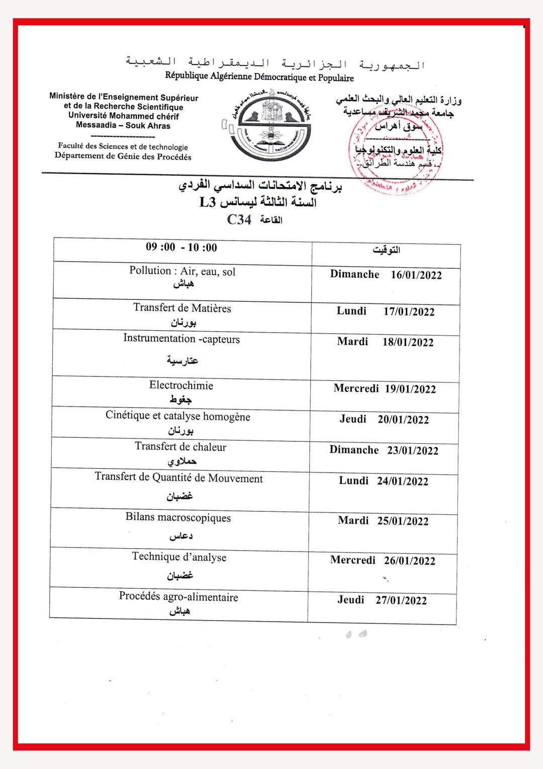 قسم هندسة الطرائق: رزنامة الإمتحانات السداسية الفردية 2021/2022