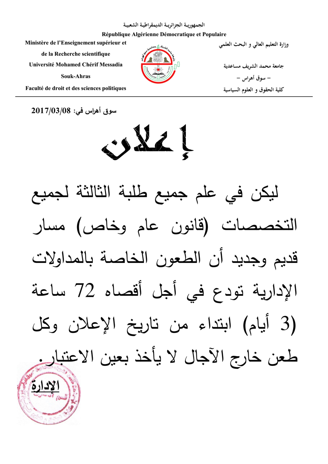 اعلان بخصوص آجال الطعون الخاصة بالمداولات للسنوات الثالثة ليسانس جميع التخصصات