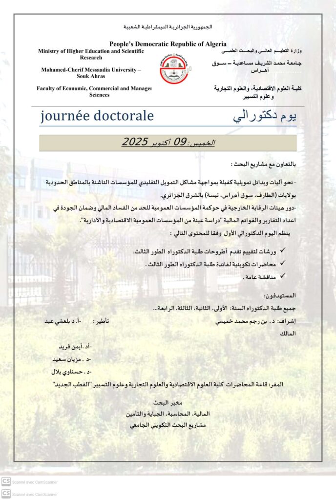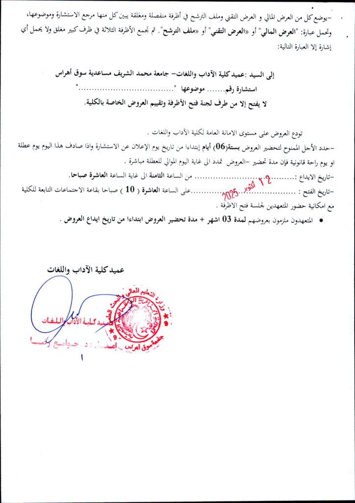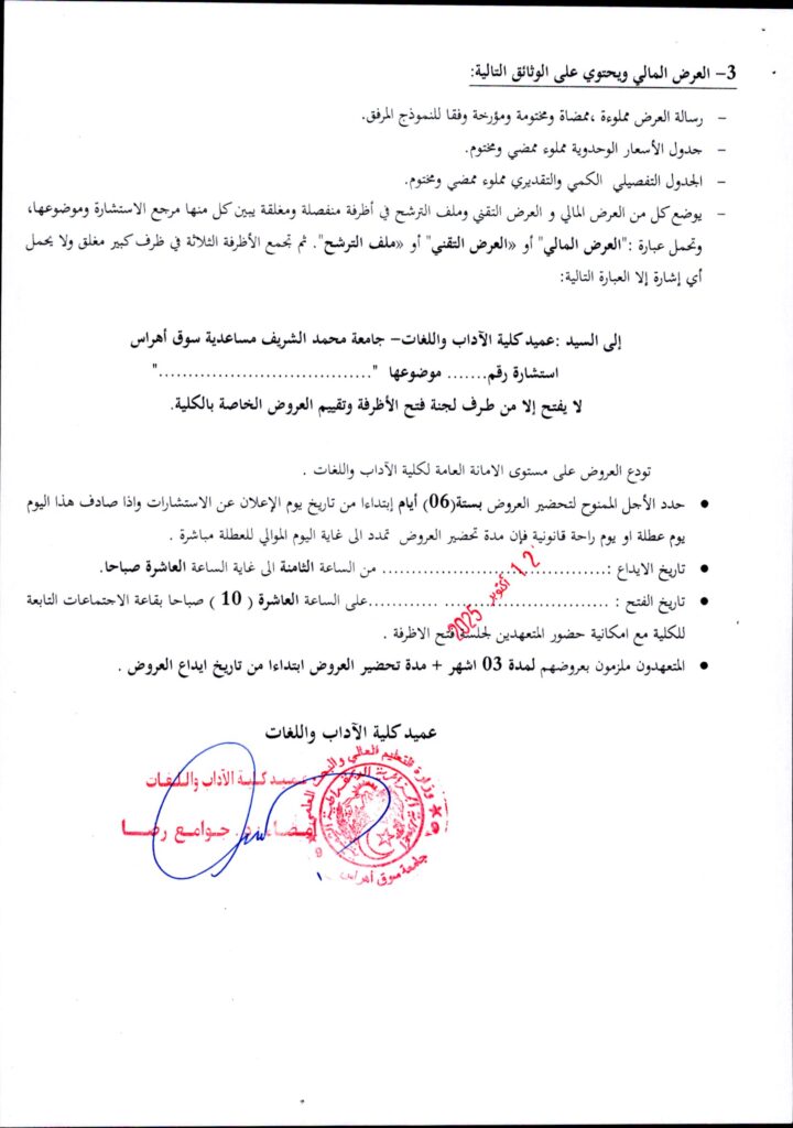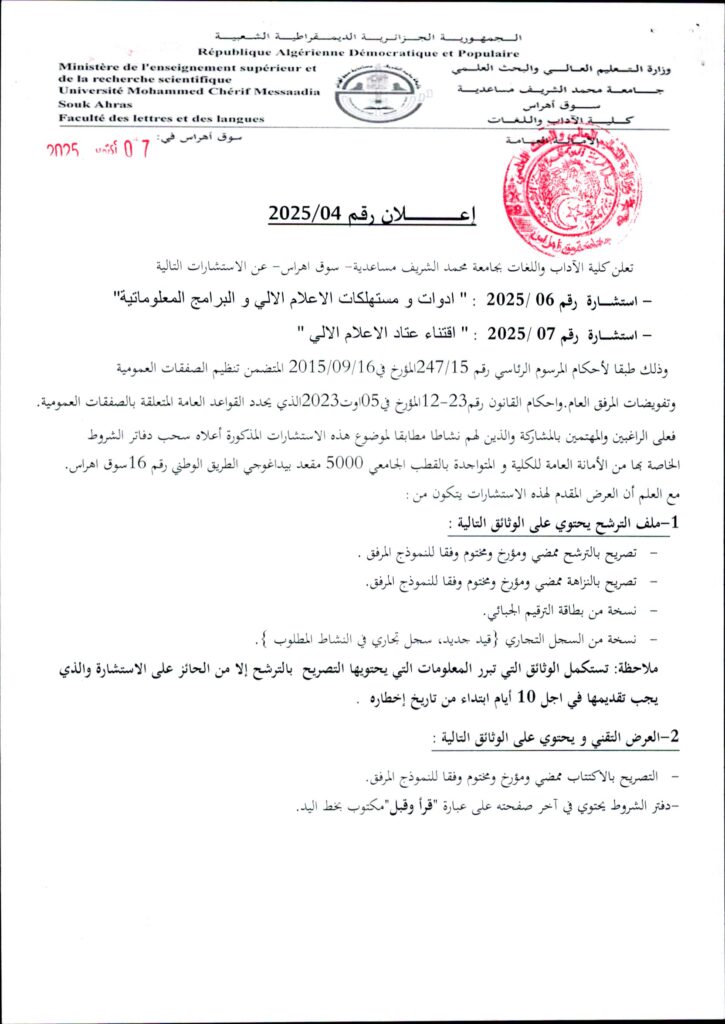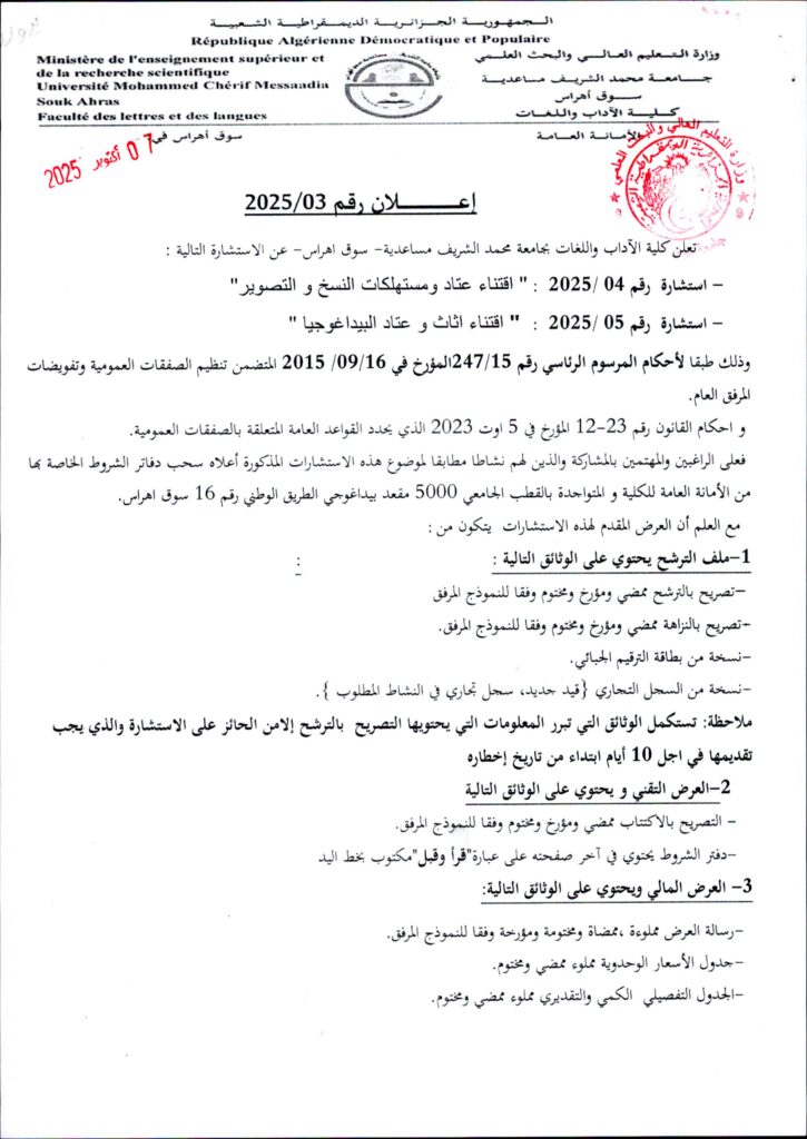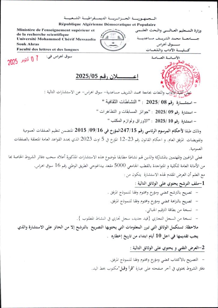 تنهي جــامعة محمد الشريف مساعدية سوق أهراس إلى علم الطلبة المقبولين للتسجيل شهادة ثانية أنهم مدعوون للتقدم إلى نيابة مديرية الجامعة مصلحة التكوين المتواصل قصد إتمام إجراءات التسجيل في الفترة الممتدة من 08 إلى 13 أكتوبر 2025 .
