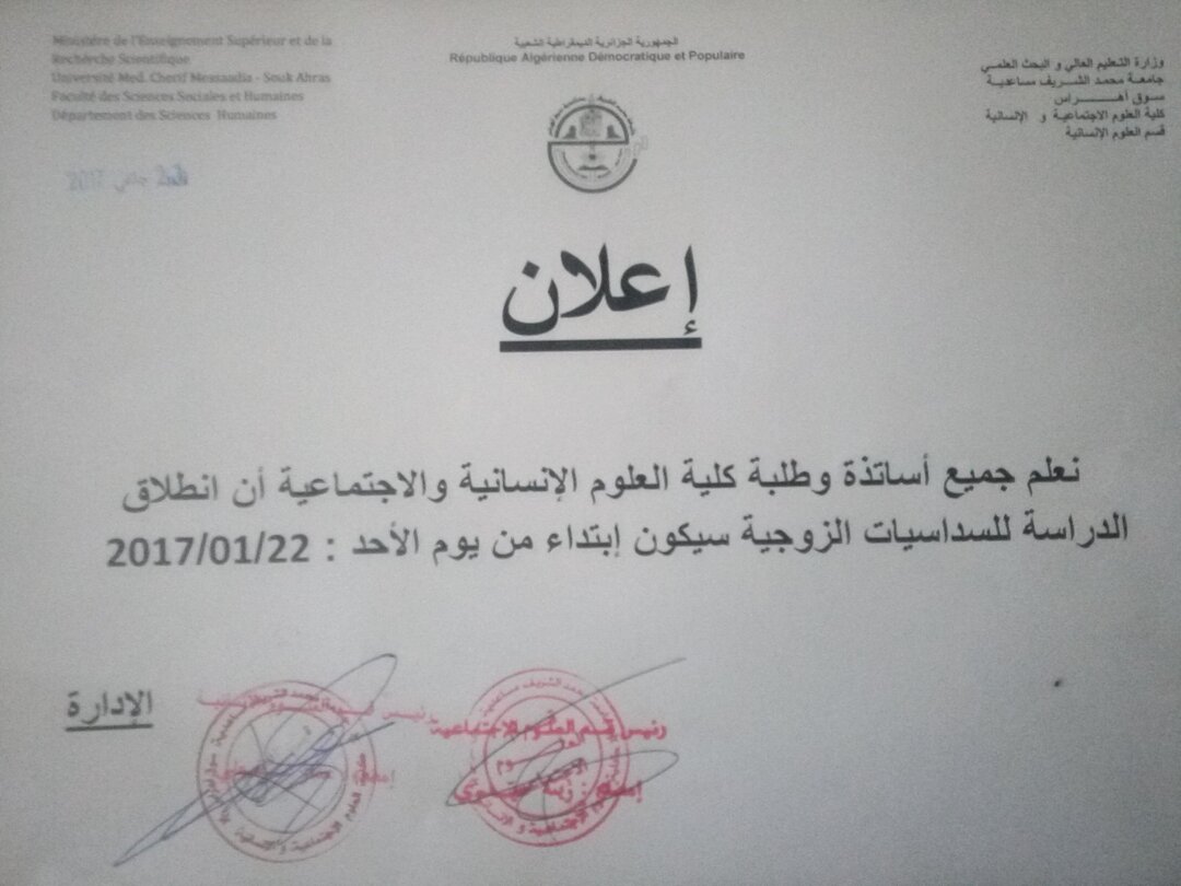 كلية العلوم الاجتماعية والإنسانية: اعلان هام للطلبة